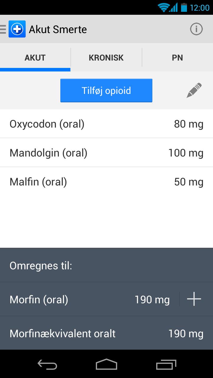 Akut Smerte helps the clinician (eg the doctor or nurse) to quickly and safely convert between different doses of morphine preparations (opioids), both for the patient with acute pain and for the chronic pain patient. In addition, the application helps with pain scoring and recording of pain medical history (history) and contains a compendium with background knowledge of Akut Smerte treatment. Akut Smerte contains information regarding the treatment of adult patients.