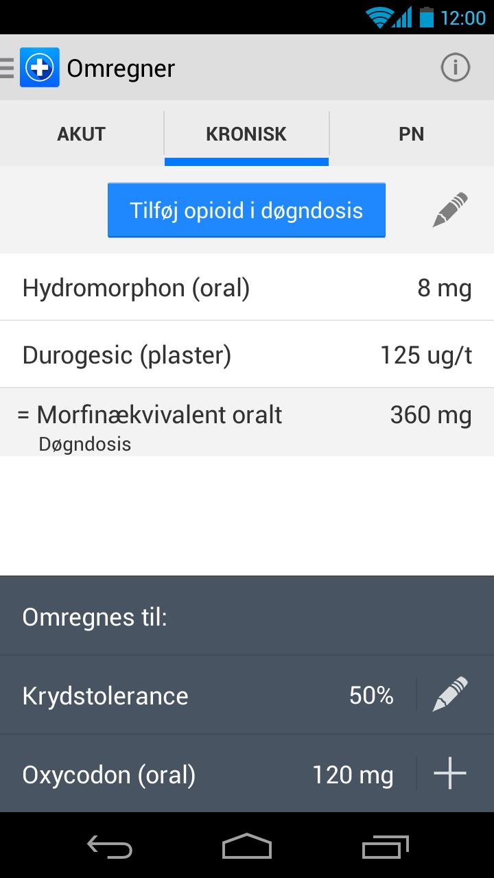 Based on the patients' current opioid treatment, most of the opioids recorded in Denmark can be converted. The converter can also calculate indicative doses for the treatment of pain breakthrough (PN doses). The application is automatically transferred data from medicin.dk and is thus always updated with the latest trading names on opioids.