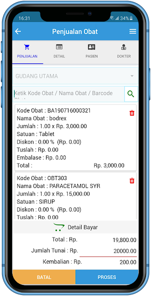 With this drug sales feature, your Pharmacy can process the sale of general medicines ANYTIME directly using your cellphone / smartphone. And even when there is a power outage, your Pharmacy can still continue the sales process by simply using an additional Power Bank so that the HP / Smartphone can be used longer to continue service to customers. So no need to worry anymore if you are still often in a Pharmacy constrained blackouts, simply provide HP / Smartphone and Power Bank only.