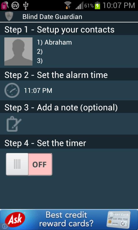 If the date starts at 7 set your first check-in for a time that you're comfortable with. Upon your first check-in, you will receive a notification. Click 'check-in' to tell Blind Date Guardian that the date is going as planned. If you do not check-in within 15 minutes, the app will send a text message to your contact(s) notifying them that you haven't checked in, and will push your date details to them.