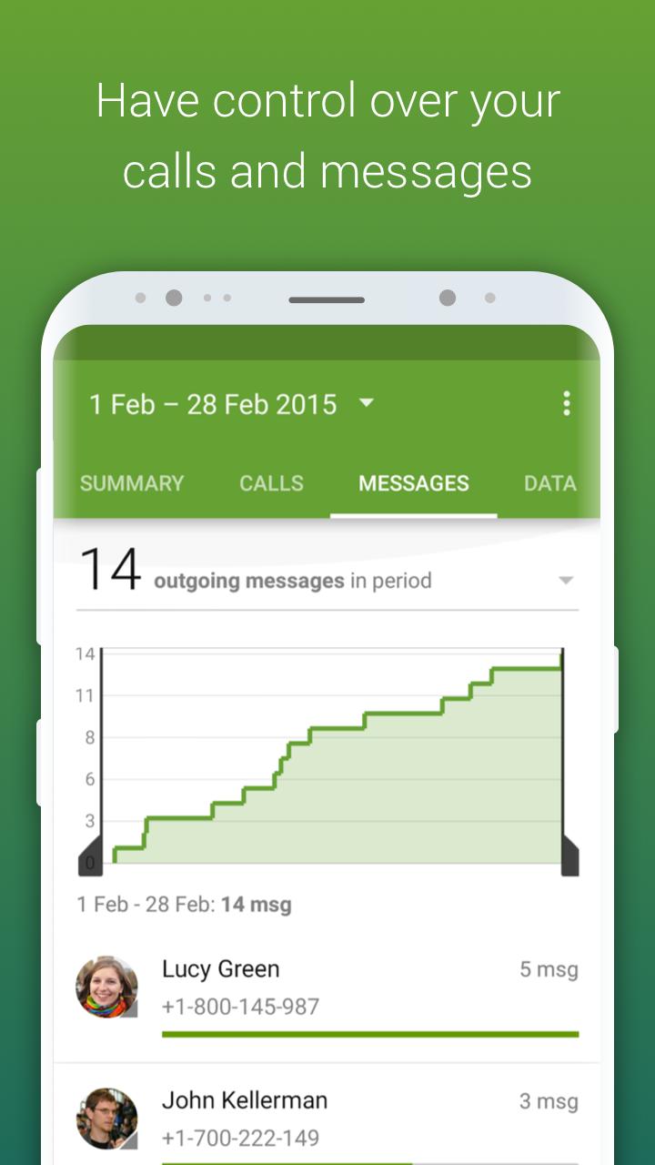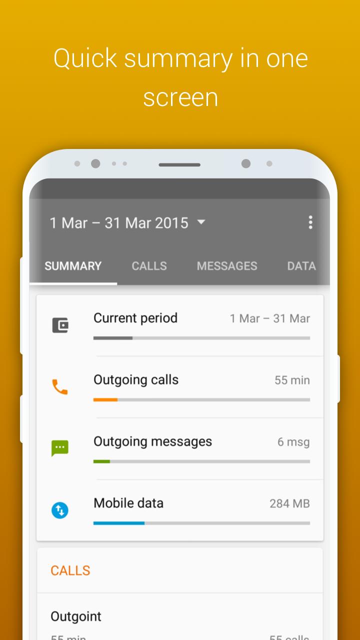 ? Usages details available via a summary screen: Get an overview of calls, messages and data usage on one page: you can customize the log view for a specific date as well as for specific time. Use the app as a data usage monitor,