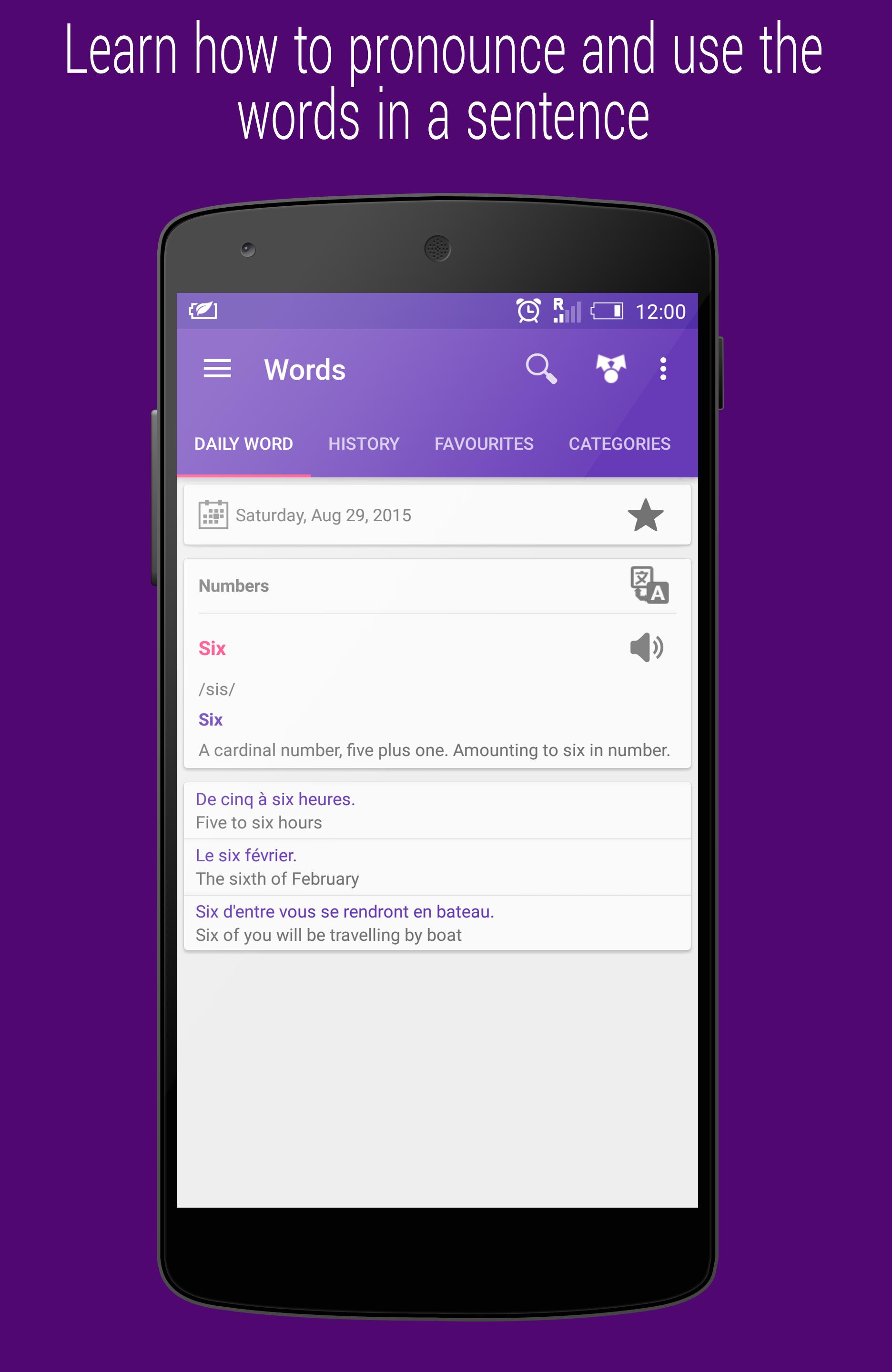 "Daily French" contains the commonly used French words and phrases for beginners and intermediate learners. You will receive a notification with a new word or phrase daily. You can practice your speaking and listening skills with the French pronunciation guide and sounds, wherever and whenever you are. The words are linked to phrases making learning French much easier as you get along with daily practice and review word usage.