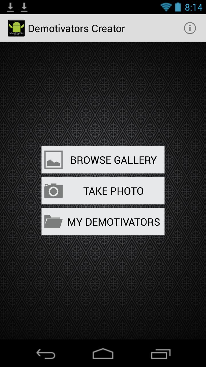 You begin creating the demotivators by selecting the desired photos from the photo gallery, or launch the camera directly from the app to instantly create a photo and "demotivate" it!.