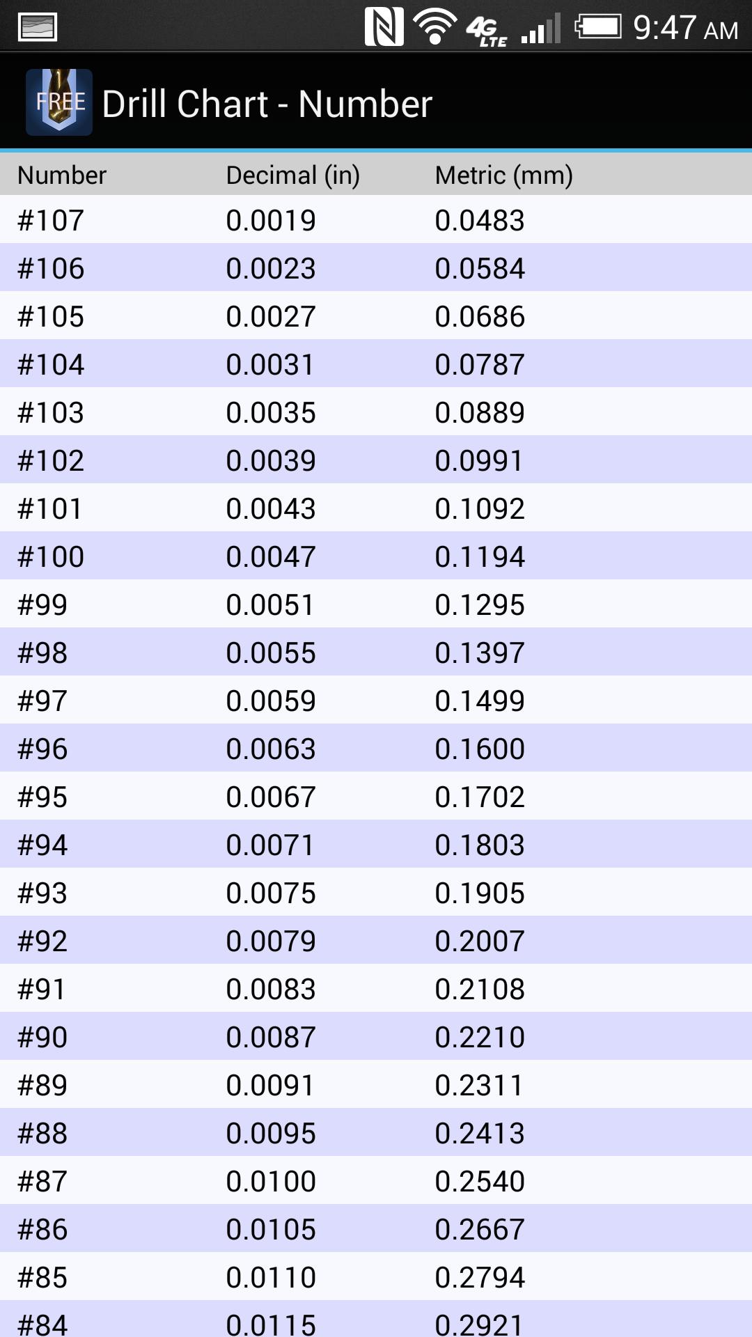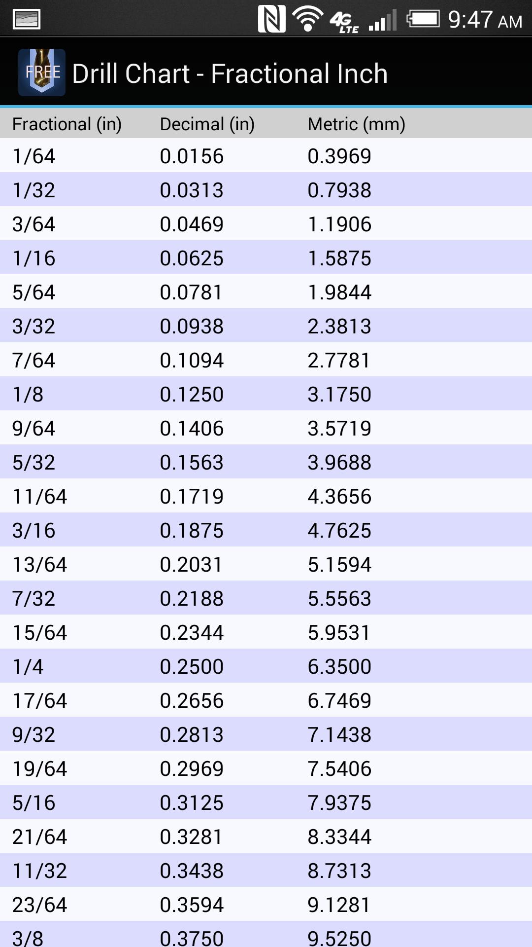 This is a very simple free app with charts for drill bits sizes in fractional inches, metric, US number, and US letter sizes. It scales to larger screens on 7" and 10" tablets for easy readability.