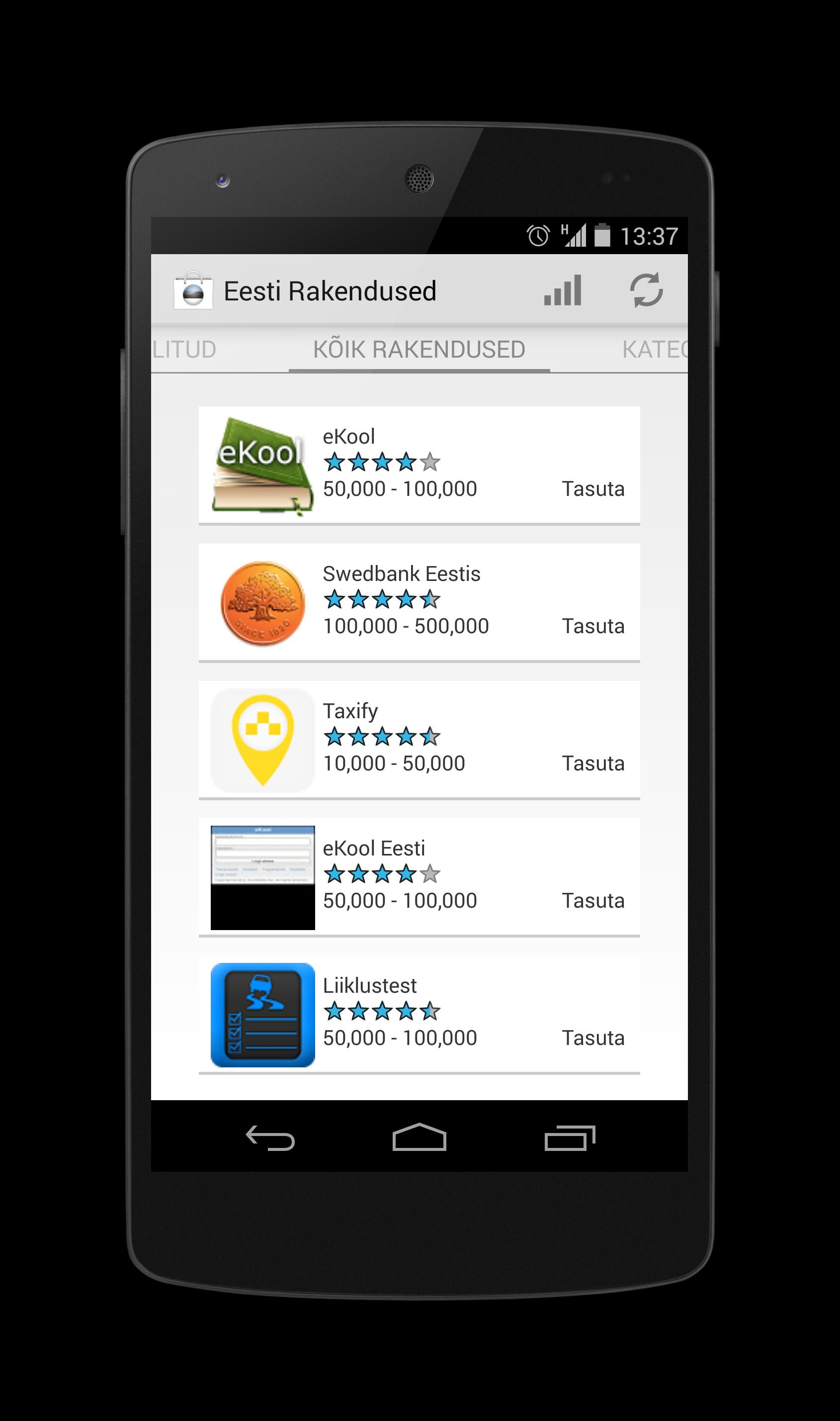 Swedbank in Estonia, traffic, speed cameras, EKool, Ekool Estonia, Emhi Weather, ERR, Invite Taxi, Taxify, Eesti Teed atlas, Euro Calculator, Auto24.ee, Bussilettid.ee, Estonian Public Transport, where is the bus? (Tallinn), Estonian Webcams, vehicle data, SEB Eesti, Minev, TV program, Hallo, Solaris cinema, parking.ee, M-parking Estonia, park.ee, M-park Beta, Mopa-Estonian Smart Parking, Id Ticket, Salary, Salary, RMK, RMK, RMK, Piletilevi, Piletilevi Speak, a recorder, English Estonian dictionary Fri, Vello tragic insulting machine, Radio spin FM, HTC Sense Input-E, Winter Garden Bird Aid, Alien Soundboard, Radio Elmar, Mushroom Aid, Mushroom Aid Mini Lexicon, Hello Kitchen, Power Hit Radio, Food Star, Supply Lagps, GPS Tripmeter, Kodu.ee TV Guide, EMT Surfport, Fish Game, Fish Game, Calculator, Tpilet, Tpilet, A. Le Coq, Digidoc 3 Android, Digital Book, Digital Book, EMT Live, Eesti Päevaleht, Eesti Päevaleht M -Tartu, Driving School, M Radio, Goldennestne.ee, ATM Locations in Estonia, Mupo Watch Mobile, Digitun Plus, Recipe App, Tartu eateries, Lõunakeskus, Estplay, Estplay, People, ENGLISH - ESTONIA Flashcards, Estonian Legislation - Laws, Lingopal Estonian Lite QWERTY PACK, Estonian Rally Results, Tallinn, Estonia, Omniva, Chopsticks Estonia, Estonian Poems, EMT Travel, Meniu.ee, Äripäev on Mobile, Vocabular Flash Cards, Sky Radio - Sky Radio - Sky радио, My Smart, News Reader, News Reader Estonia, Right Rule in Traffic, Paeviletid.ee, Estonia - Free Guide & Map, Postimees by Curlify, Estonian Services, announced, Statoil Estonia, Elmo EV Charging, Taximeter, Elisa Support Information, Euro Calculator, ETAXI24 - Taxi Driver, Ring FM, Energy FM ESTONIA Coach App, Photoluks - Pictures on Paper, Estonia Guide by Triposo, Forbes Estonia, Estonian Dictionary, Estonian German Words Trainer, Estonian Dictionary, Estonia Radio Music & News, Geo Model, 1182, Recipes, Estonian Offline Map, 3D MAP ESTONIA Mathematical Dictionary, Diilport, Offline Map Tallinn, Estonia, Estonian Radio Estonia Public Holidays, Top Estonia Live Radio Free, Song and Dance Celebration, Chronicle, Cosmopolitan Estonia, Estonian Woman, Te.MU.KI, Technology World, Fish! Club, Baltic News, Anne & Style, Wonderful Science, Women, Wonderful History, Kodukiri, Health Plus, Topgear Estonia, Estonian Nature, Handicraft, Own Taste, Body Mass Index Calculator, 3D Estonia Flag LWP +, Estonia Radio, Baltic Radio Music & News, Lantern Flash Screen ESTONIA ESTONIA, ESTONIA FM & Construction, Penal Code - Estonia, Geosoft, Esbl, Smarttasker, Estonia Flag LWP, Horizon, Oriental Daniel Vasser's Blog, Triinu Blog, VKÜ, Church of God (Estonian), 1 Eurocent, Home & Garden Stories Mother, Garden, Sofa, Mystical Stories, Estonia Radio Collection, Magic Flag: Estonia, Dating Pro Estonia