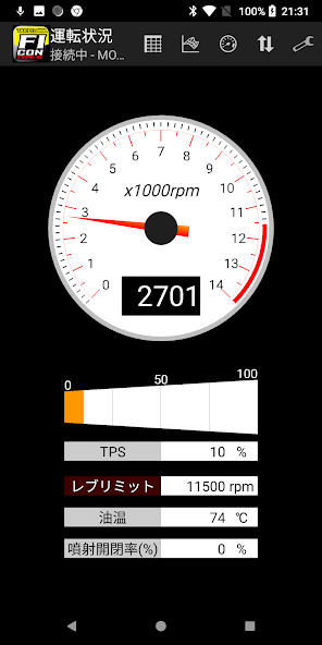 Application for FI CON TYPE-e installs basic application free of charge. In the free application you can connect with FI CON TYPE-e and display the tachometer and Throttle posion and you can try to see if your smartphone can connect with FI CON with BlueTooth.