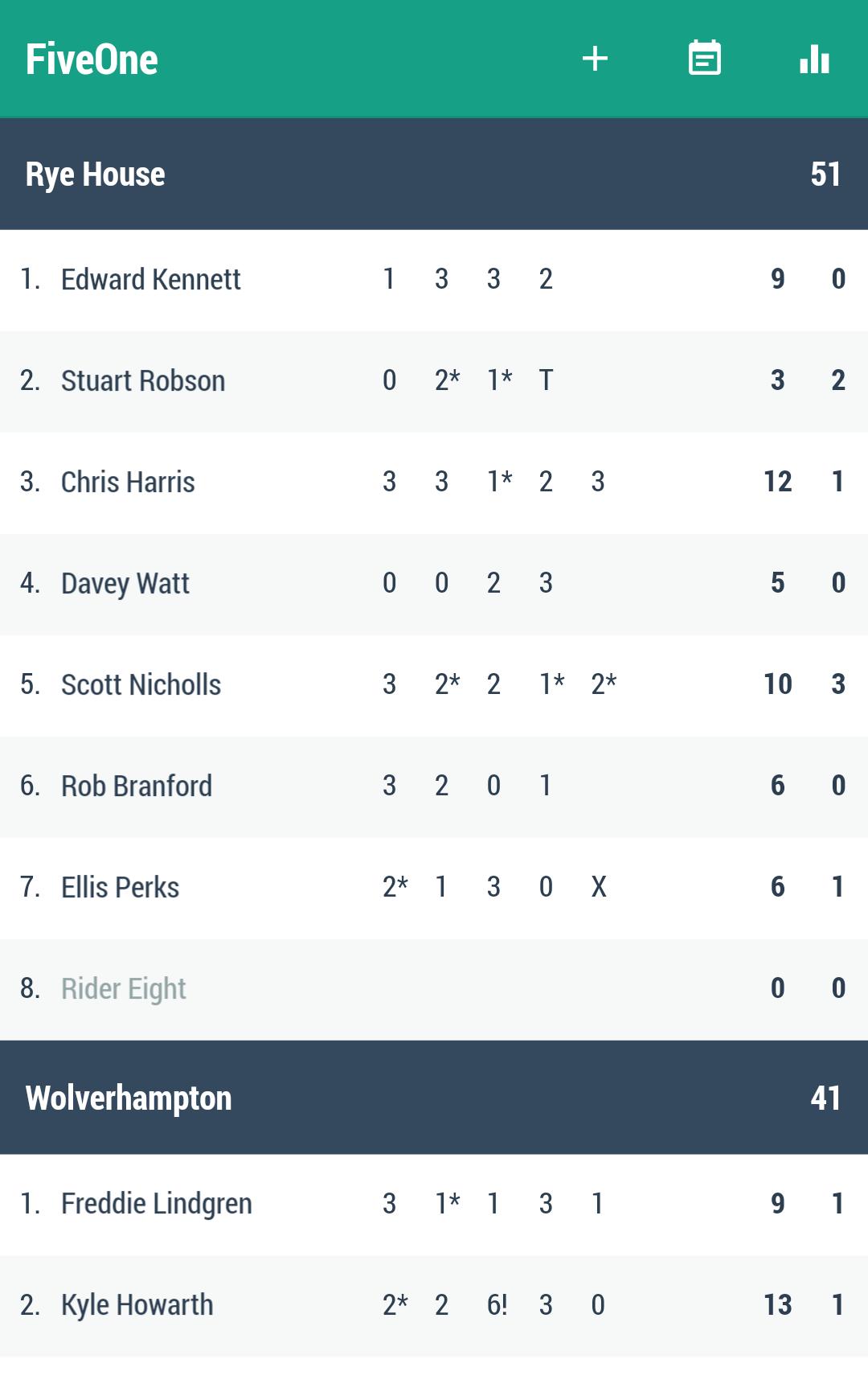 Select home and away teams to auto-complete rider line-ups, then simply tap in finishing order to assign points for each heat. Progressive totals and rider scores update in real-time.