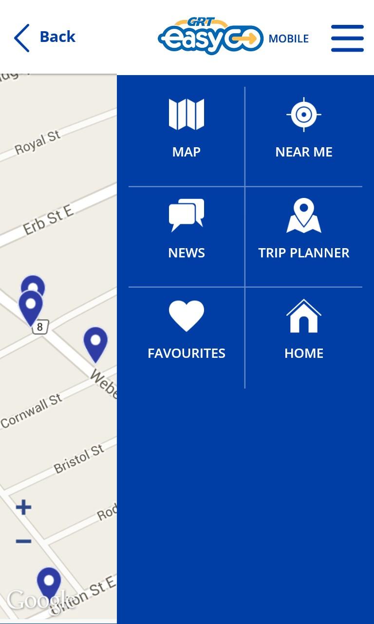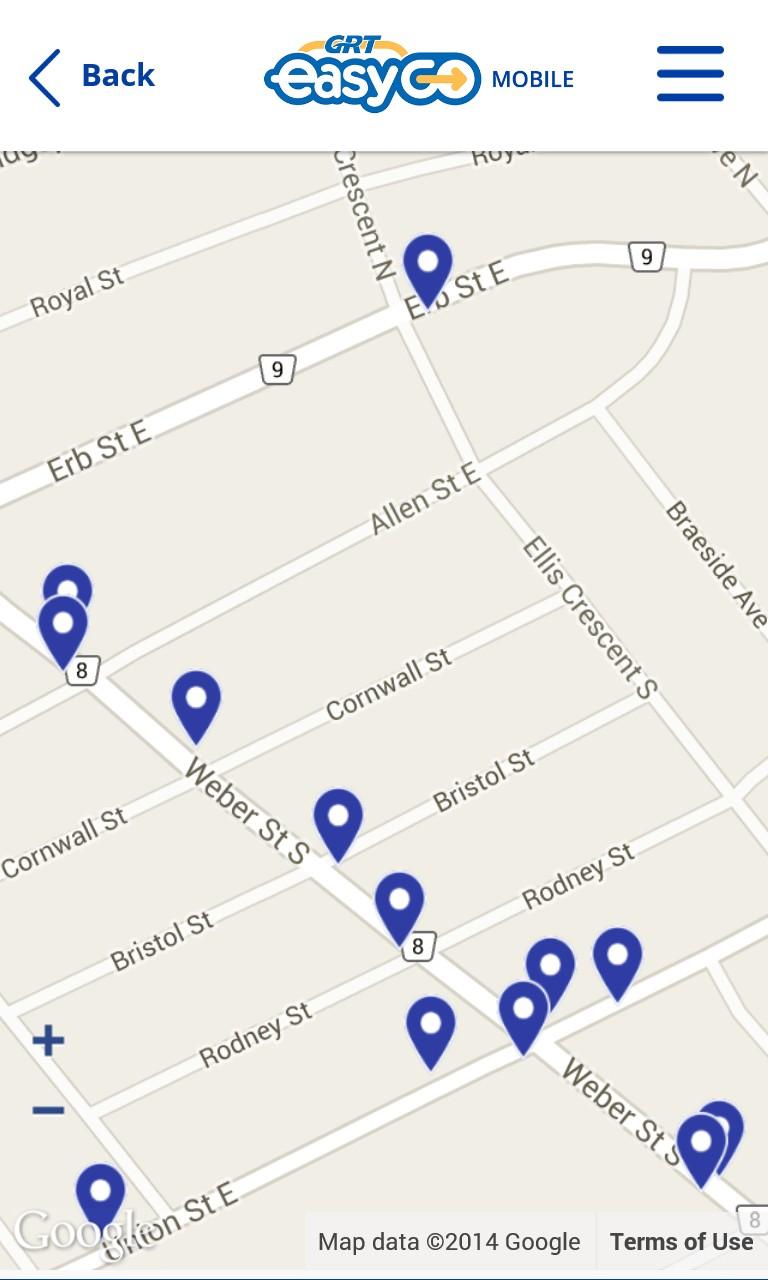 The official GRT easyGO mobile application is a free interactive tool for Waterloo Region riders to have instant access to Grand River Transit real-time bus information. Bus arrival times, bus geolocations, route information, live news feeds, and links to our mobile trip planner and detour information are all features included in the mobile application.