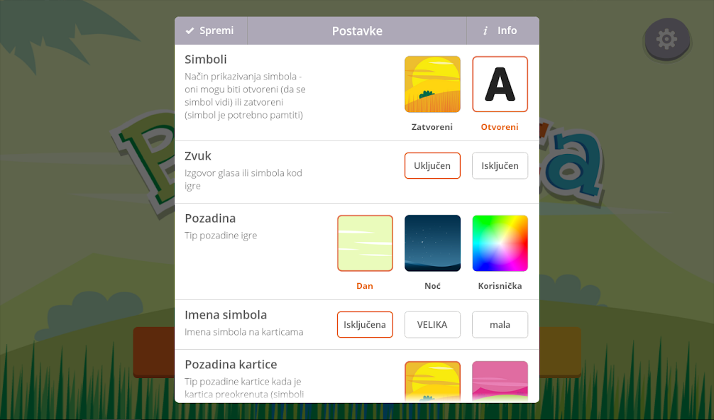 Pamtilica belongs to a series of applications that are intended to encourage predvještina reading in a fun and attractive way. Very often wrongly believes that for successful mastery of reading only important to master the appointment letters. The concept of phonological awareness is a key predvještina reading because children before formal reading instruction become skilled in identifying, isolating and "handling" areas smaller than words. The application is intended for all preschoolers who show an interest in predvještine reading, but also for those who are still in the process of identifying and allocating the first vote. Application Pamtilica based on the symbol display in the user interface in the form of a network of symbols and their pairing based on initial vote and its structure resembles the game memory. Each symbol is associated with the appropriate text and selecting symbols reproduces the sound track. Besides encouraging separation of the first vote, Pamtilica can encourage the adoption of new words and forming links letter-voice. Depending on the individual needs and capabilities of users, the application implements the various setup options (by choosing the background color, the number of couples choosing to turn on / lock text with the name of the symbol).