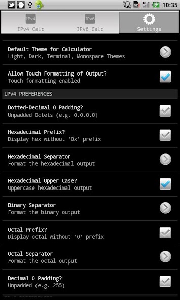 The application is useful for subnetting a router in tandem with an Android web browser or just for educational purposes. Education is emphasized by real time updating of network, broadcast, netmask, first and last address of the subnet, and the number of usable IPs in several different formats (dotted-decimal, hexadecimal, octal, decimal, binary and decimal). Also there are basic notes.