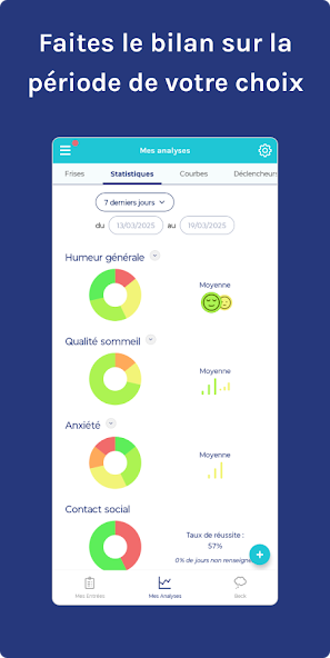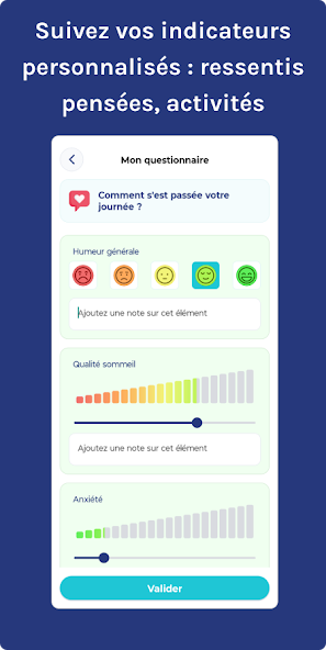Thanks to a daily questionnaire that asks you to evaluate personalized indicators of your mental health (symptoms, feelings, behavior or thoughts), to note the significant events of your day, or to provide information on your treatment intake, you will not forget no more important information to report during consultations with those involved in your psychological care journey (psychiatrist, psychologist, psychotherapist, nurse, peer helper, specialized educator, etc.).