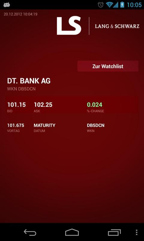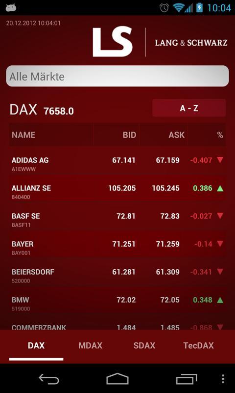The Lang & Schwarz app for Android ™ smartphones gives you free mobile access to the Realtime courses from Lang & Schwarz. In addition to our share prices, you will receive the Lang & Schwarz Indication on the DAX® known from TV and Internet Börsen reporting. All information is constantly updated by push technology.