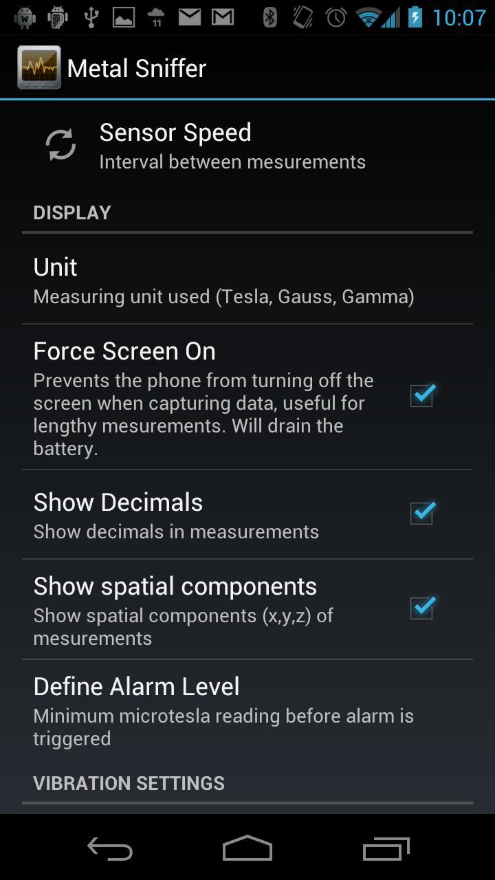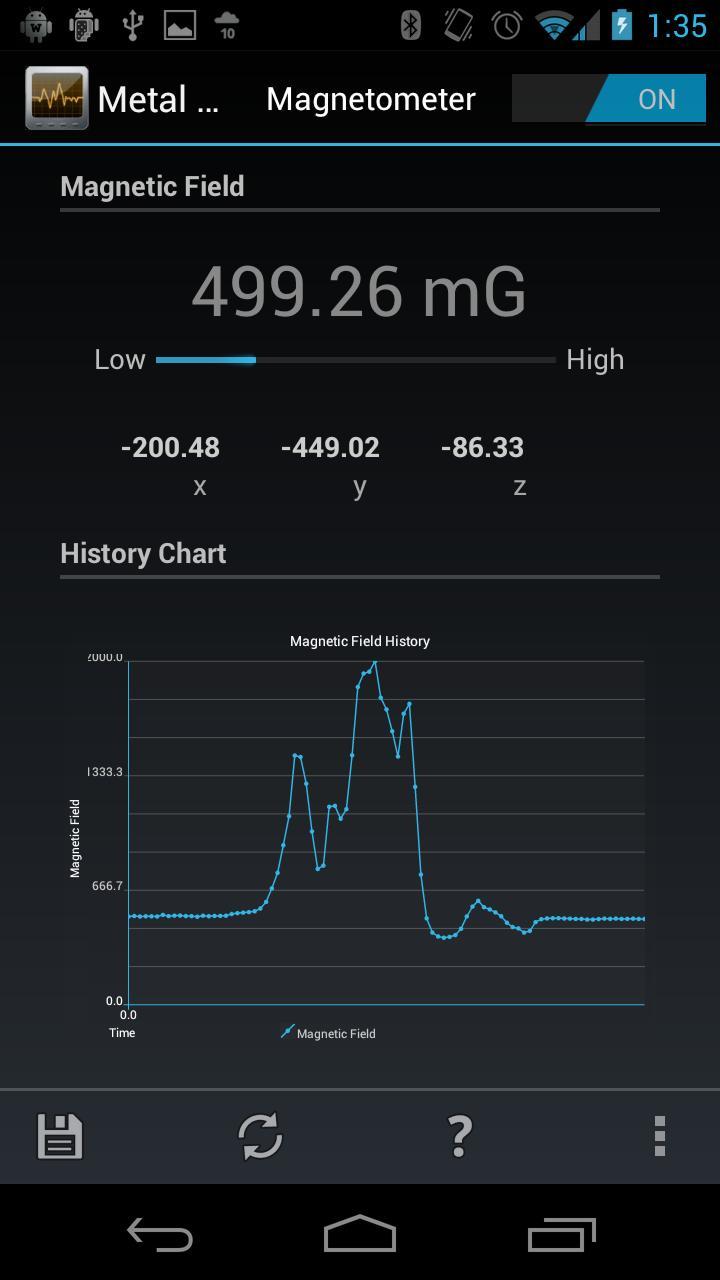 Readings are separated per dimension, and is given in the unit of your choice (Tesla, Gauss, or Gamma), and combined to give a scalar reading. You can set a threshold at which the phone will vibrate when a critical reading has been reached.