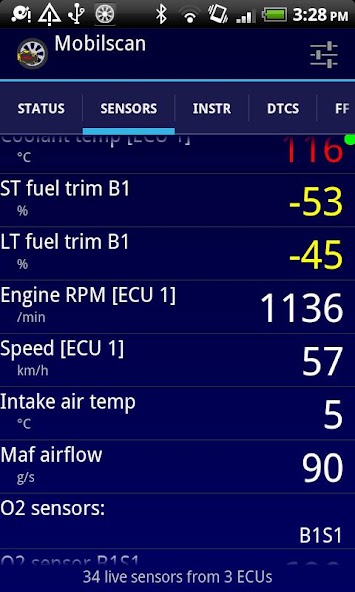 Mobilscan gives access to car information as defined by the ISO standards about OBD, this means that you can read out fault codes, continuously receive and display a full list of engine parameters like oxygen sensor readings, air mass, temperature sensors and other parameters used by the engine control computer (ECU).