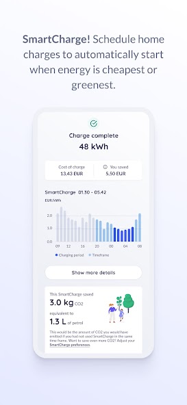 - Charge greener and cheaper: schedule charges to automatically start when electricity prices and CO2 emissions are at their lowest