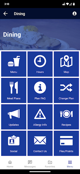 • Dining Menus – Easily see what’s on the menu at any of the dining locations on campus. Browse what’s for breakfast, lunch or dinner. All menus are broken down by the current week, so you can see what’s going to be served on Monday or later in the week on Friday.