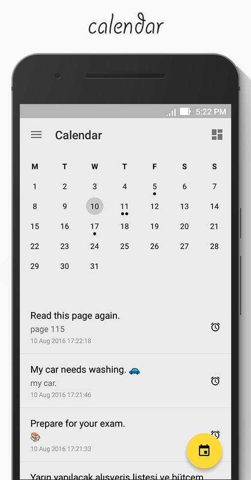 You can take your notes fast and easy with Notun notebook. You can add reminders, write your notes, translate your texts and notes with speaking option.