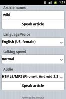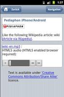 Let your phone read out the Wikipedia for you! Text-to-Speech (TTS) interface to the Wikipedia online encyclopedia. Based on the free Pediaphon web service. Learning while jogging and driving! E-learning and M-learning with your mobile phone! A MP3 file for offline usage will be generated too. Learn foreign languages with Wikipedia!