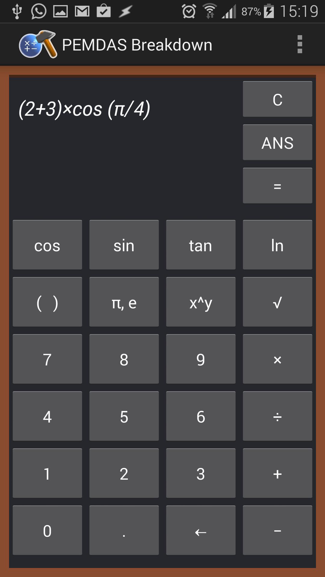 PEMDAS Breakdown helps you to solve simple AND complicated math problems. Unlike other calculators, it shows you step by step how to solve the problem and write the solution exactly the way that math teachers expect from you. If you are still learning the PEMDAS rules or if you just want to check your results this app is perfect for you.