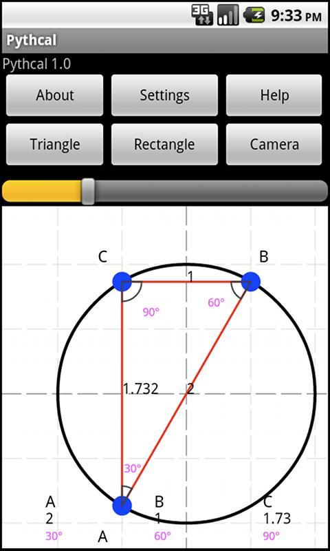 PythCal (Pythagoras Calculator) lets the user graphically manipulate a triangle. This is done by touching and dragging the corners, while the angles and the length of the sides are instantly displayed. You can also create any triangle by entering the lengths of the three sides directly.