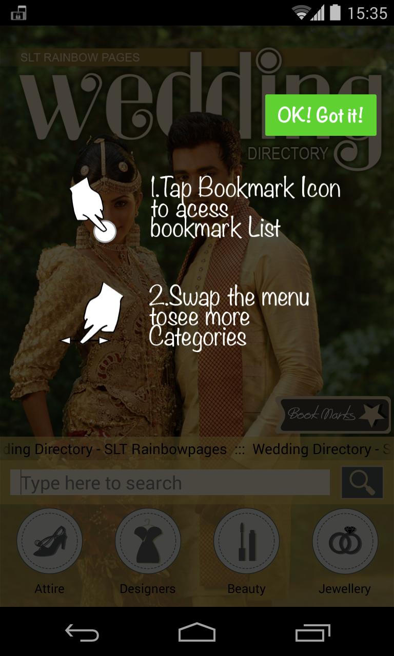Your feedback on the SLT RAINBOW PAGES Wedding Directory App will be appreciated. Please e-mail us at [email protected]. We are always looking for your valuable ideas on how to provide the best experience possible for you.