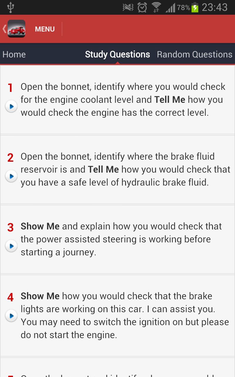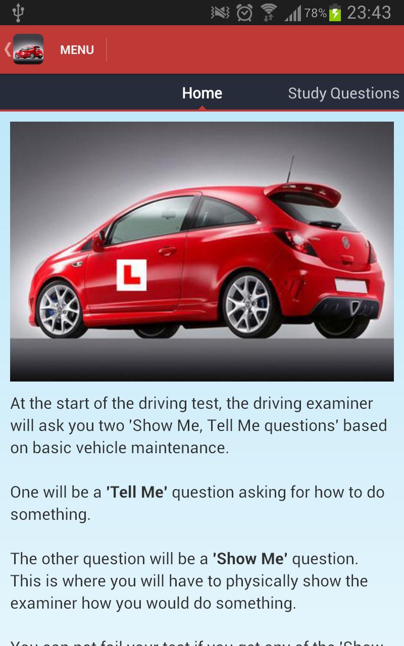 At the start of your driving test, the examiner will ask you two 'Show Me, Tell Me' questions based on basic vehicle maintenance. This app illustrates the 19 possible questions and provides answers and instructions with pictures ensuring you a great start to the exam!