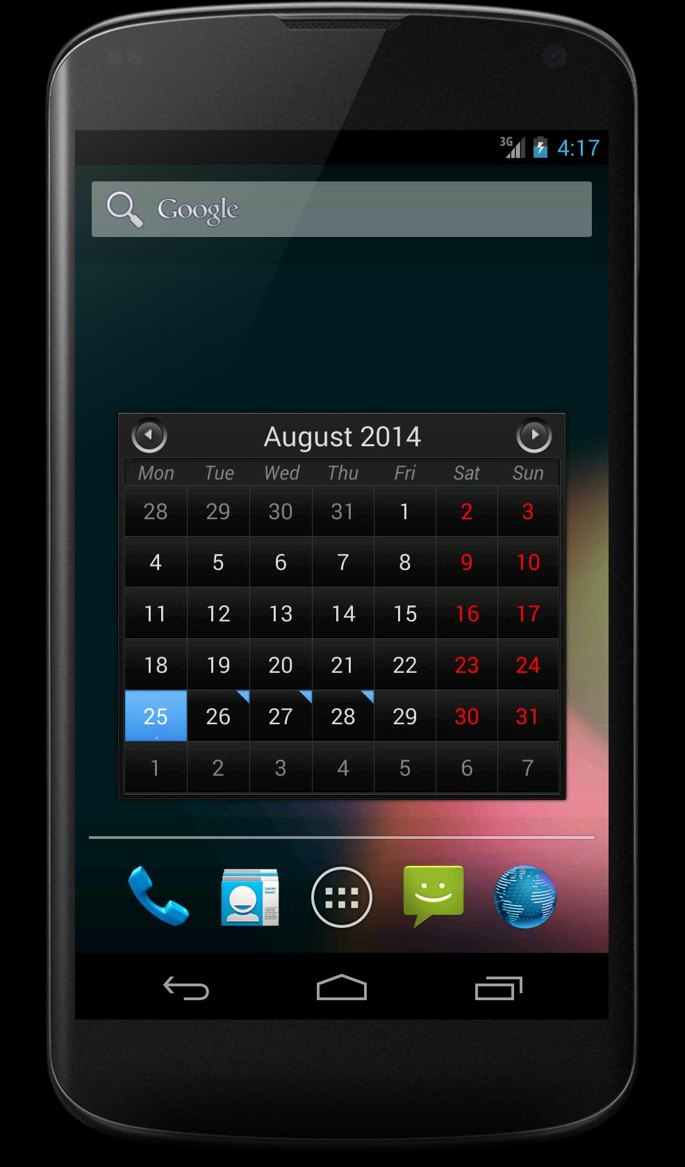 Simple calendar widget that shows current month and date. Week starts from Monday. Weekends are highlighted with red color. There's option to view previous and next months.