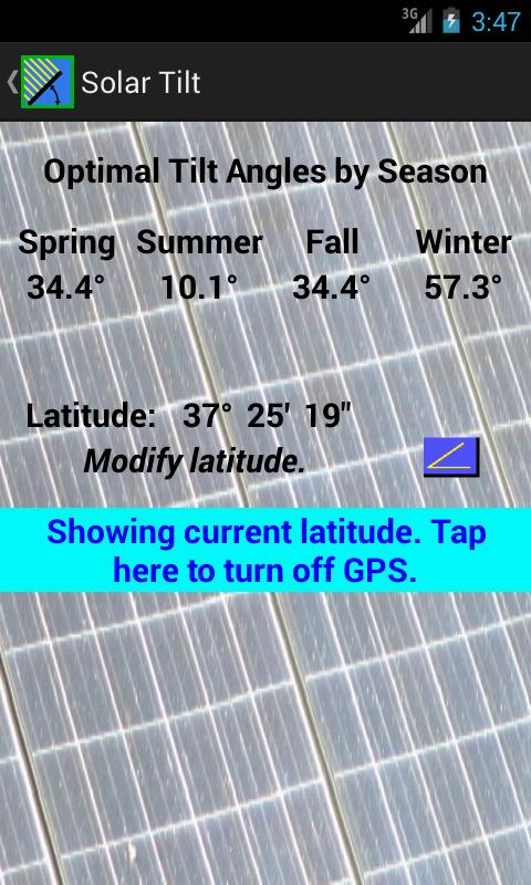 -Provides tilt angle for the current date and the latitude determined by the device's GPS location.