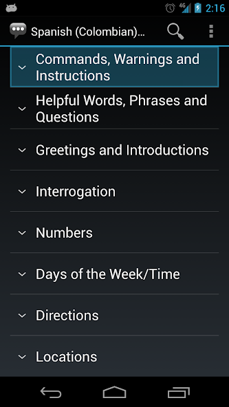 Using this app, you can select an English phrase and view its translation and how to pronounce it in Spanish (Colombia).