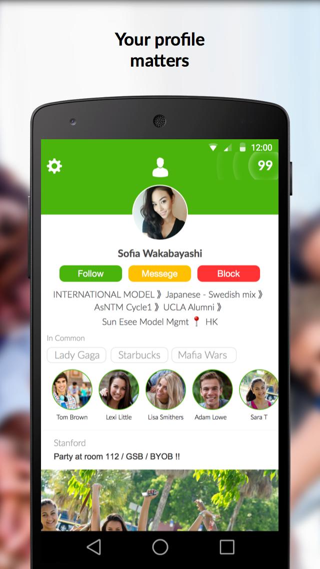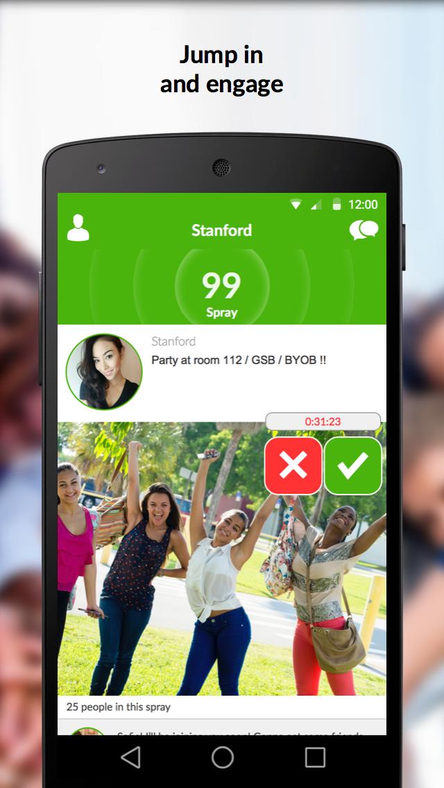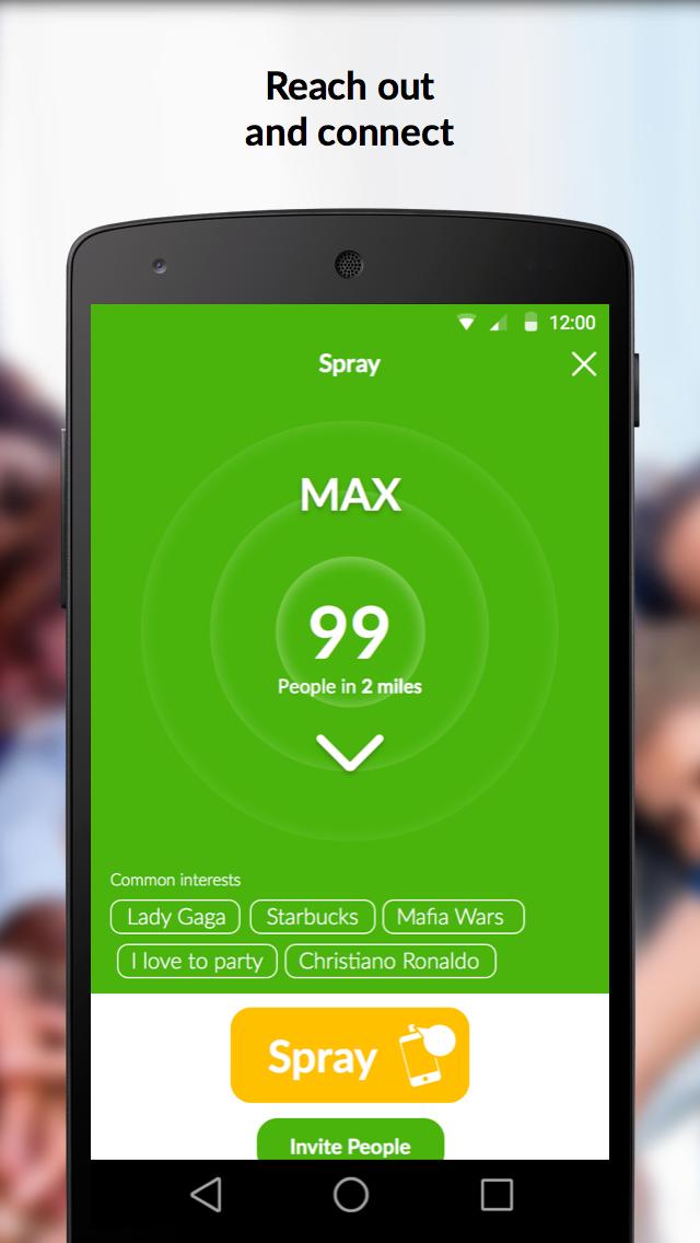 Use Spray to see what people nearby are chatting about and get involved. Start a public chat by sending a Spray to as many as 99 users within a 9-mile radius. You can also narrow who receives a Spray by sending it only to people with common Facebook or Twitter interests.