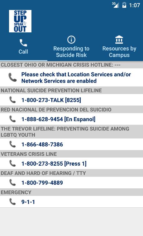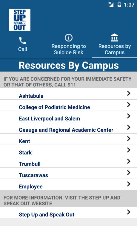 Step Up and Speak Out is a suicide and violence prevention campaign that promotes campus safety and greater awareness of mental health concerns. Users can be connected to the 24-hour suicide prevention crisis line geographically closest to the user’s physical location (within the state of Ohio). Information is also provided on risk factors for suicide, how to help a friend, and available mental health resources for KSU’s 8 campuses.
