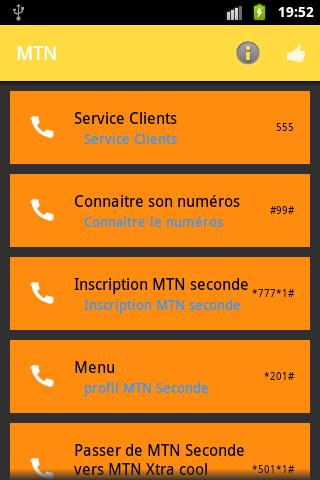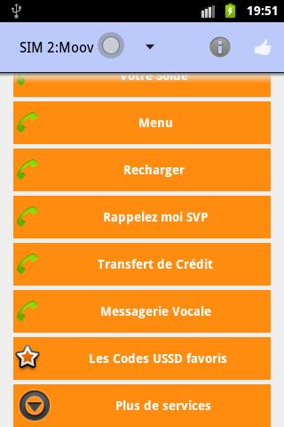 USSD SERVICES is an application that provides easy access to the most recurring services (USSD your balance, Call me, ...) in mobile operators in Ivory Coast. You are no longer required to learn by heart all the USSD code (* 120 # .....), you just have to launch the application and select the desired service.