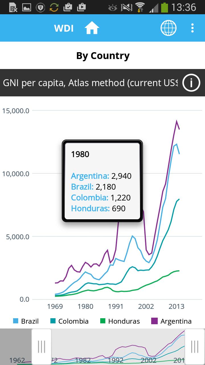 The World Development Indicators (WDI) DataFinder is an app for accessing data on global development indicators from The World Bank Group. This multilingual app gives access to national, regional and global estimates, compiled from officially recognized international sources, on topics such as: World View, People, Environment, Economy, States and Markets, and Global Links. Features include quick access to selected subsets of major indicators, with the ability to view tables, charts and maps and share them through email and social media.