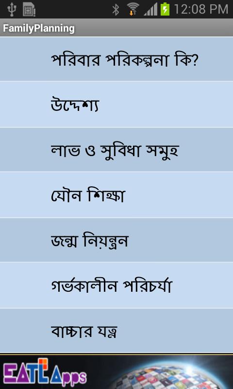 ارتفاع معدل نمو السكان يمثل مشكلة حاسمة في بنغلاديش. إنها واحدة من أصغر دولة في العالم التي لديها أعلى كثافة سكانية. يساعد هذا التطبيق الشعب البنغلاديشي من خلال توفير المعلومات مع البنغالية.