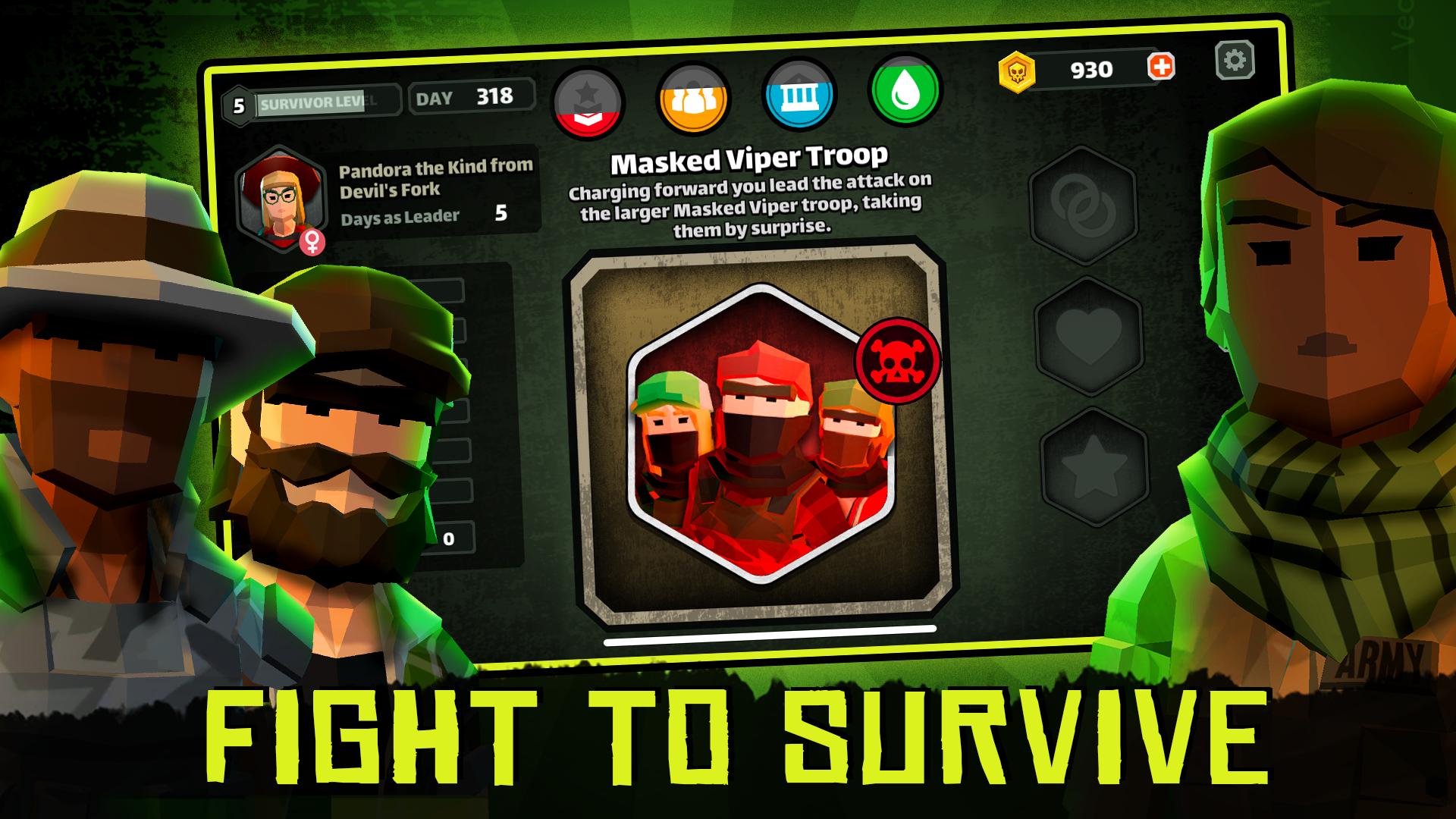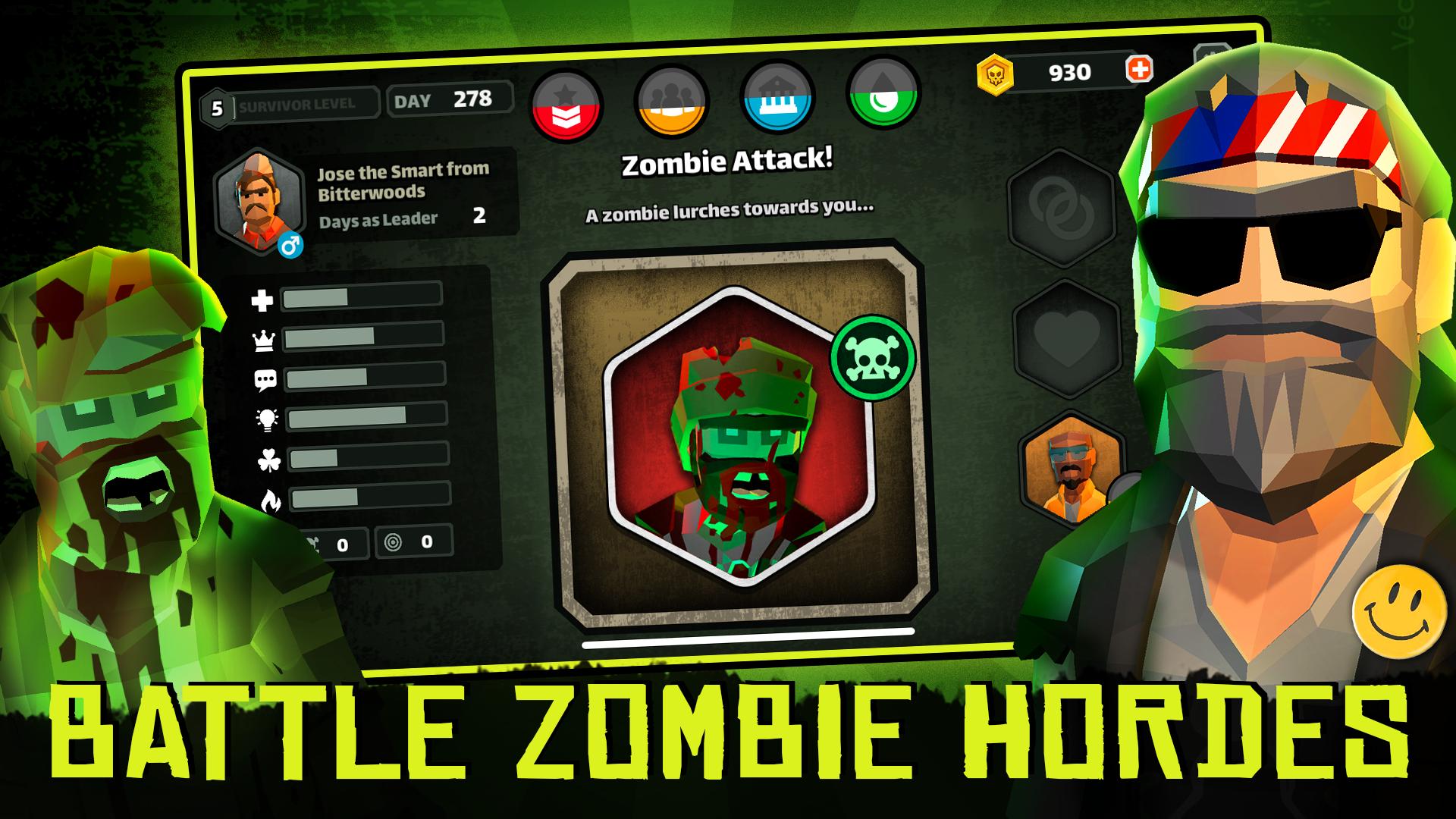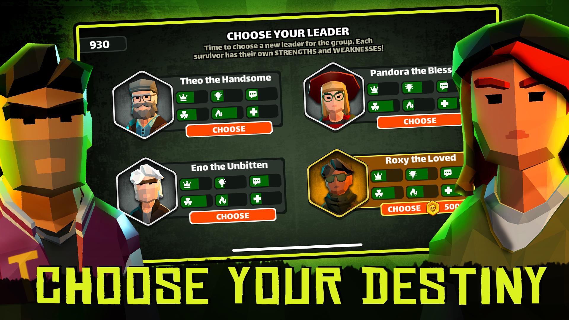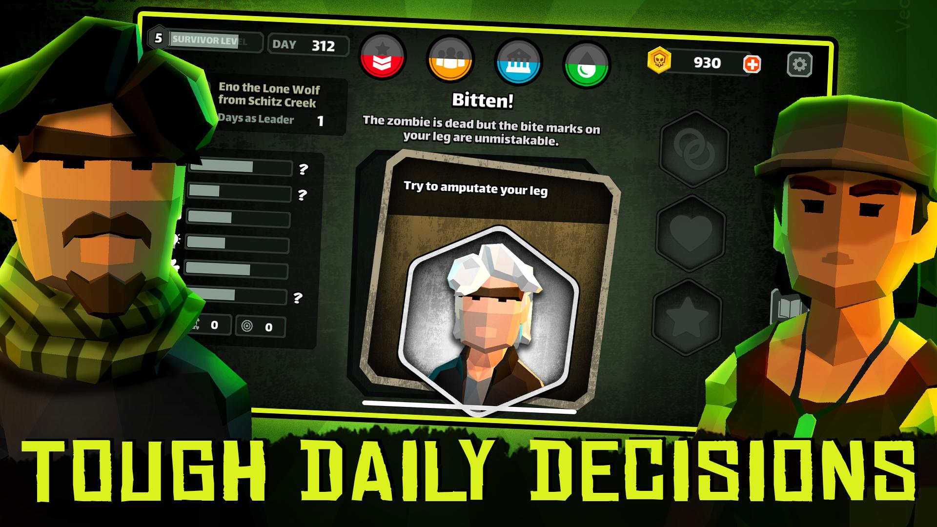 اسحب اليسار أو اليمين كل يوم لاتخاذ قرارات مهمة لمجموعتك وأنت تسعى لتحقيق التوازن بين الجنود والمتابعين والشيوخ ومواردك المحدودة. يمكن أن يكون كل خيار هو الفرق بين مجموعتك التي تنجو من نهاية العالم أو تصبح جزءًا من حشد الزومبي.