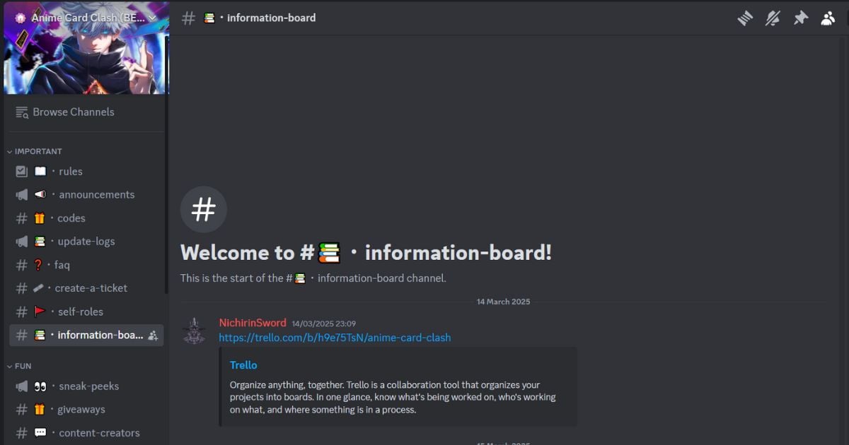 Below, you can find the links for other useful Anime Card Clash resources, including the official Discord server, game link, and Roblox group. They don't contain all the information the Trello has, but you'll get updates and announcements there before they show up on the Trello board.
