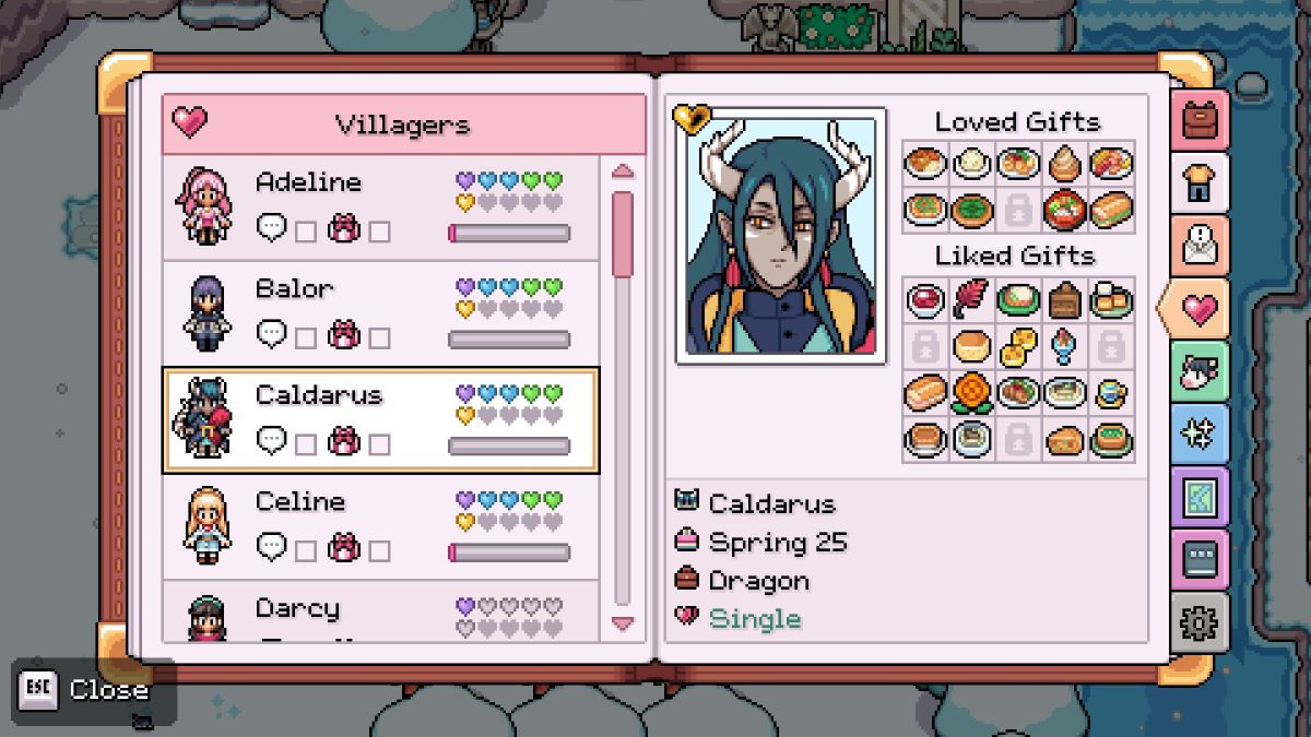 Many items have yet to be added to Fields of Mistria and some preferences discovered through data mining have changed with the March 2025 update, leaving some of Caldarus’ liked and loved gifts up in the air at the time of writing. More will be discovered with future updates from developer NPC Studio.