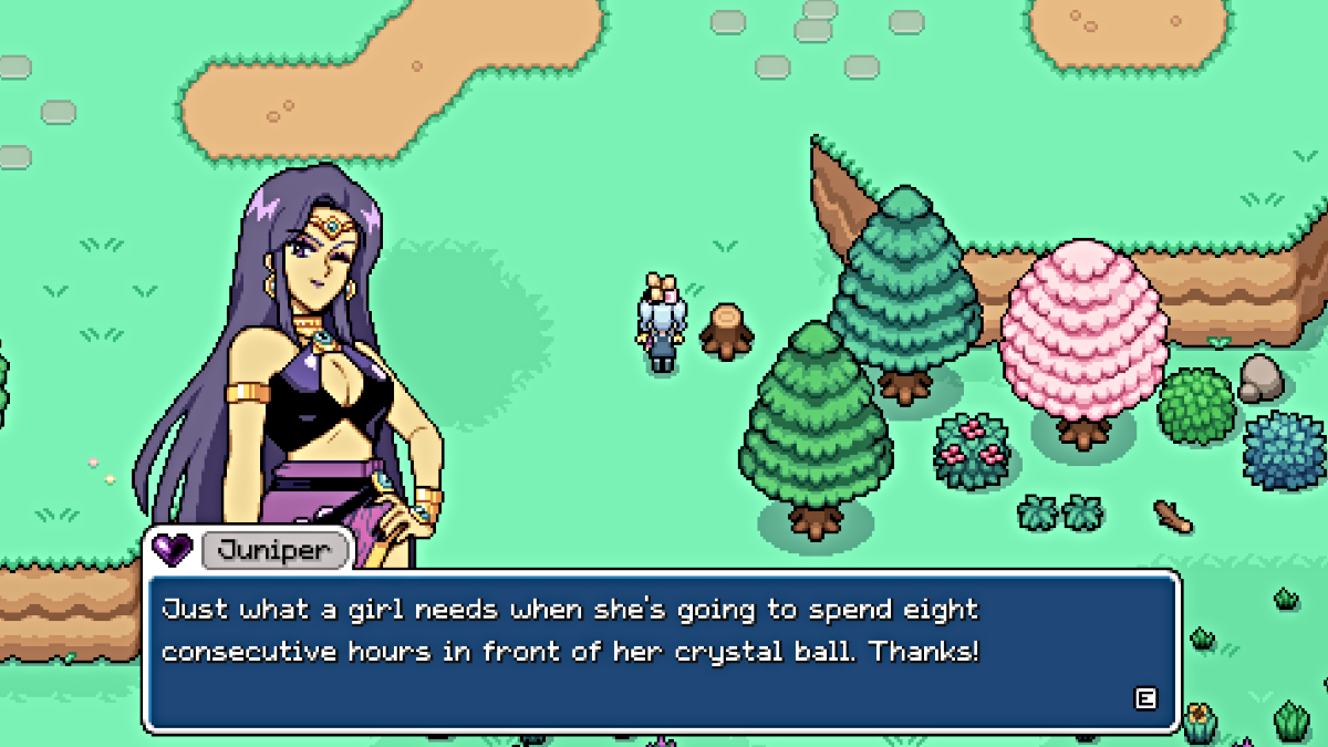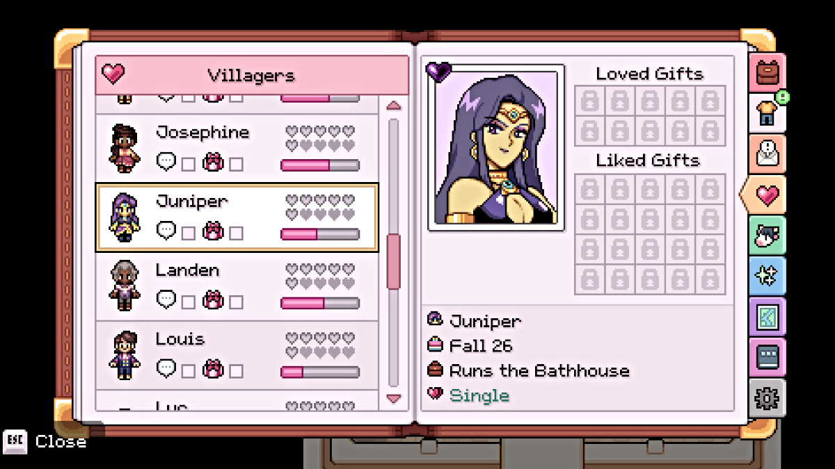 Juniper is one of the many romanceable characters in Fields of Mistria. When she’s not out running around looking for strange witchcraft ingredients, you can find her at the bathhouse she runs in the northeastern part of town.