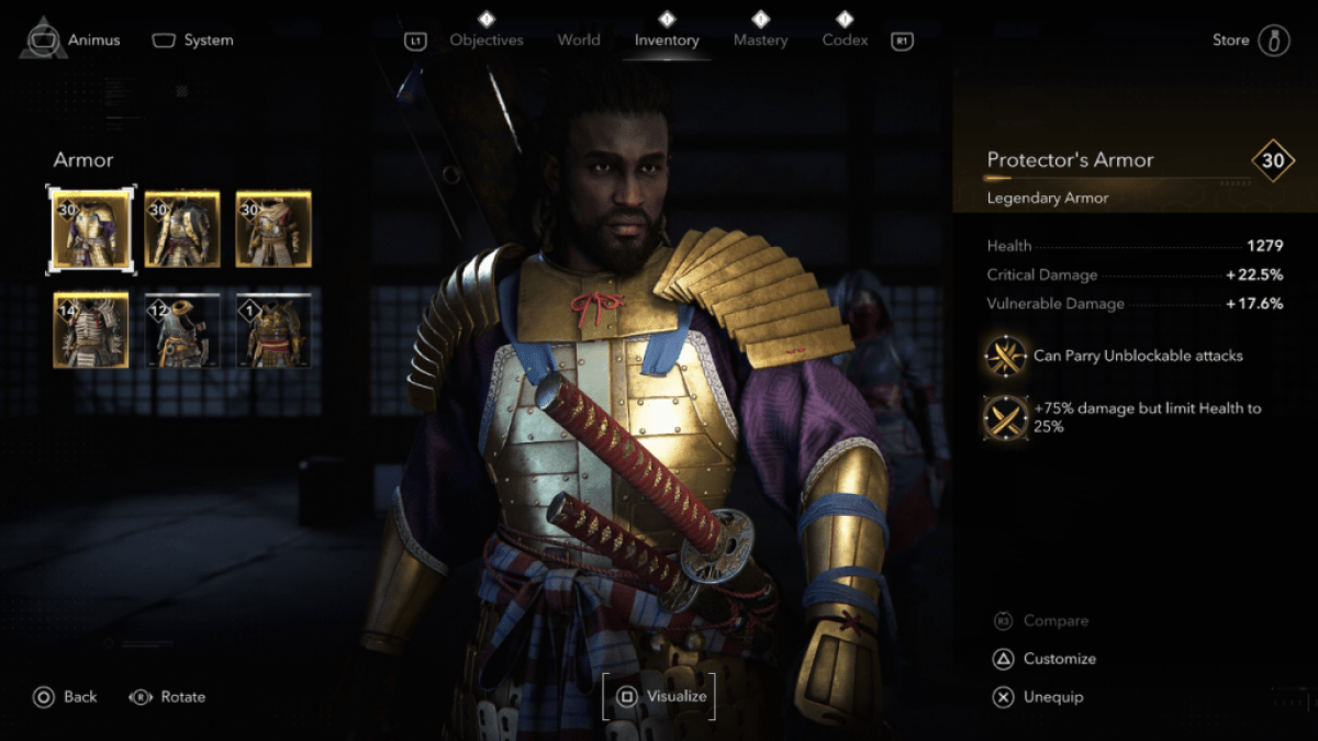 As stated before, the Long Katana is the most effective weapon for The Tournament in Assassin’s Creed Shadows. We recommend using the highest rarity Long Katana you have, and being sure to take it to your hideout’s blacksmith and upgrade it to the highest level you can. Giving it an engraving that increases Armor Damage or Armor Piercing is also a massive help. Perhaps the most important choice in your loadout however is your armor. Not only does this boost your health, it also can provide abilities from engravings that completely change combat.