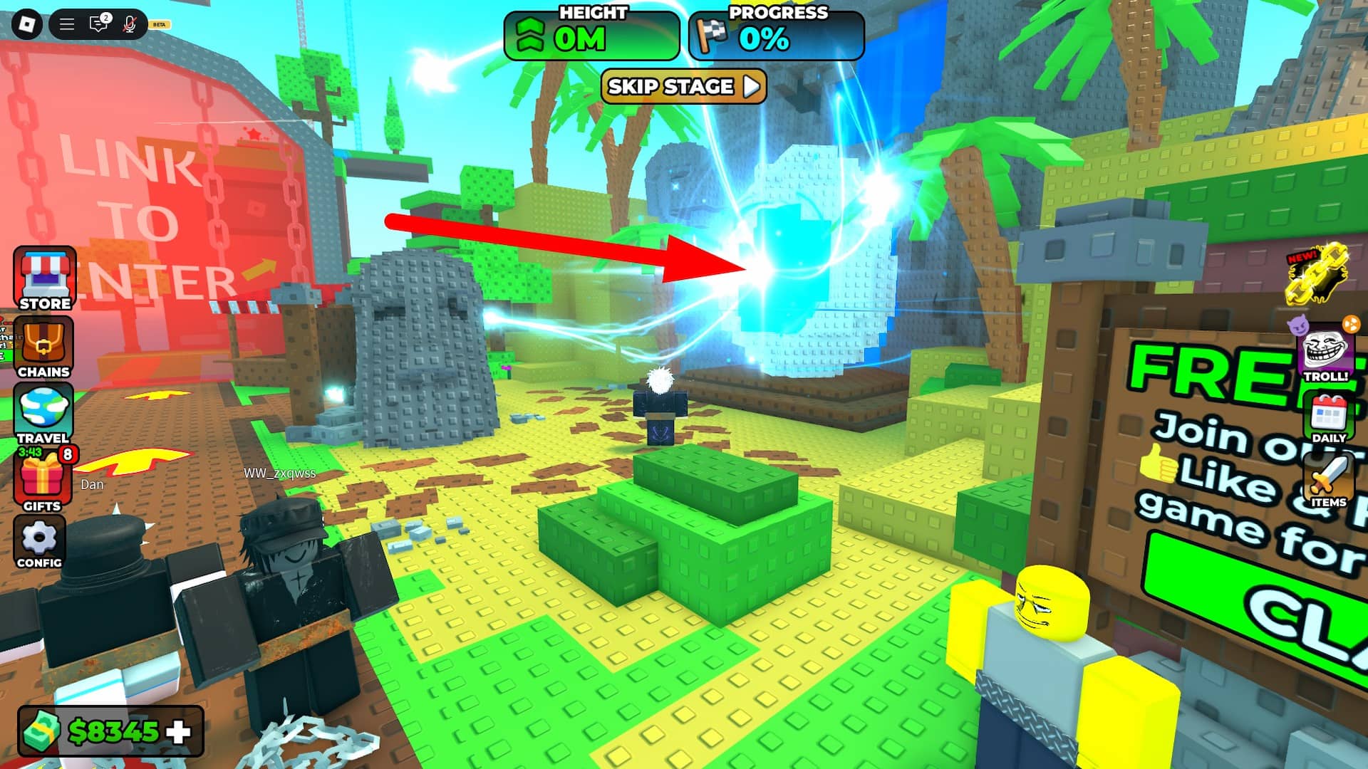 Once you have a pair, enter The Hunt event stage portal. It's the blue-glowing portal on the right side of the main lobby. Continue on and complete the special stage. Here are some gameplay tips for The Hunt Chained 2 Player Obby event stage: