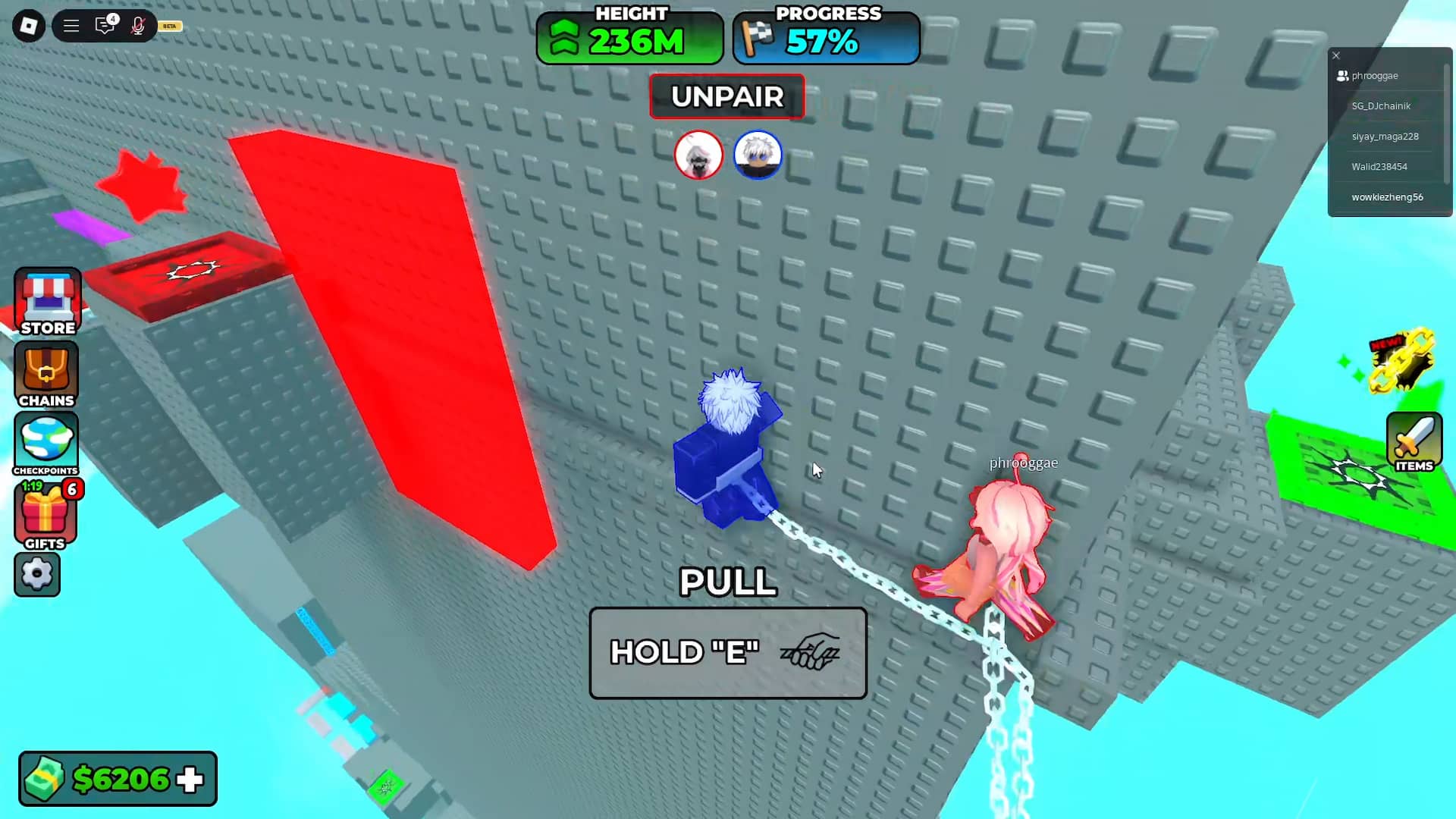 First, join Chained 2 Player Obby on Roblox. You can also enter it through The Hunt Mega Edition lobby. Then, pair up with another player by approaching them and holding E (you have to play this in a duo; it's a 2-player obby, after all).