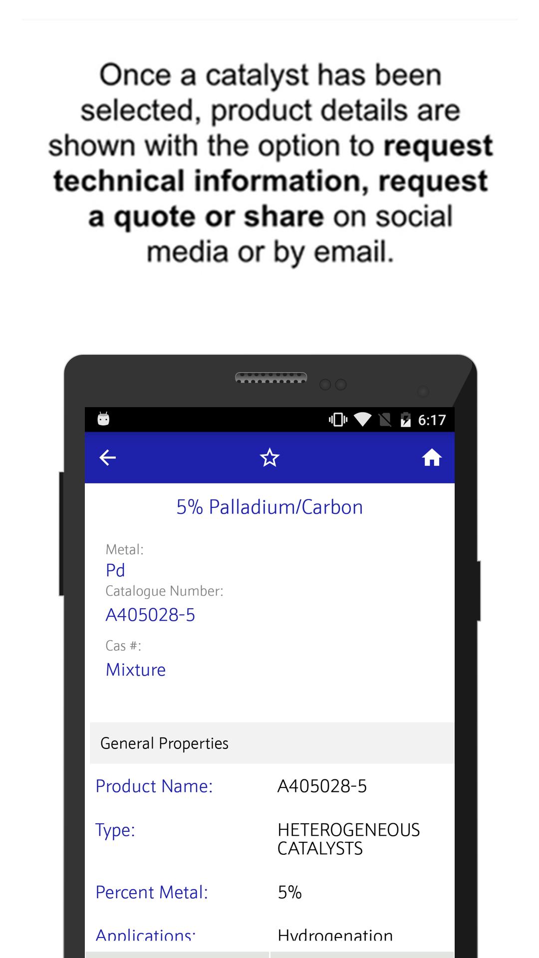 Zusätzlich zu den Katalysatorempfehlungen verfügt die App mit durchsuchbaren Produktlisten und relevanten Literaturreferenzen sowie globalen Kontaktinformationen und Bürostandorten über eine bequeme chemische Abstracts Service (CAS).