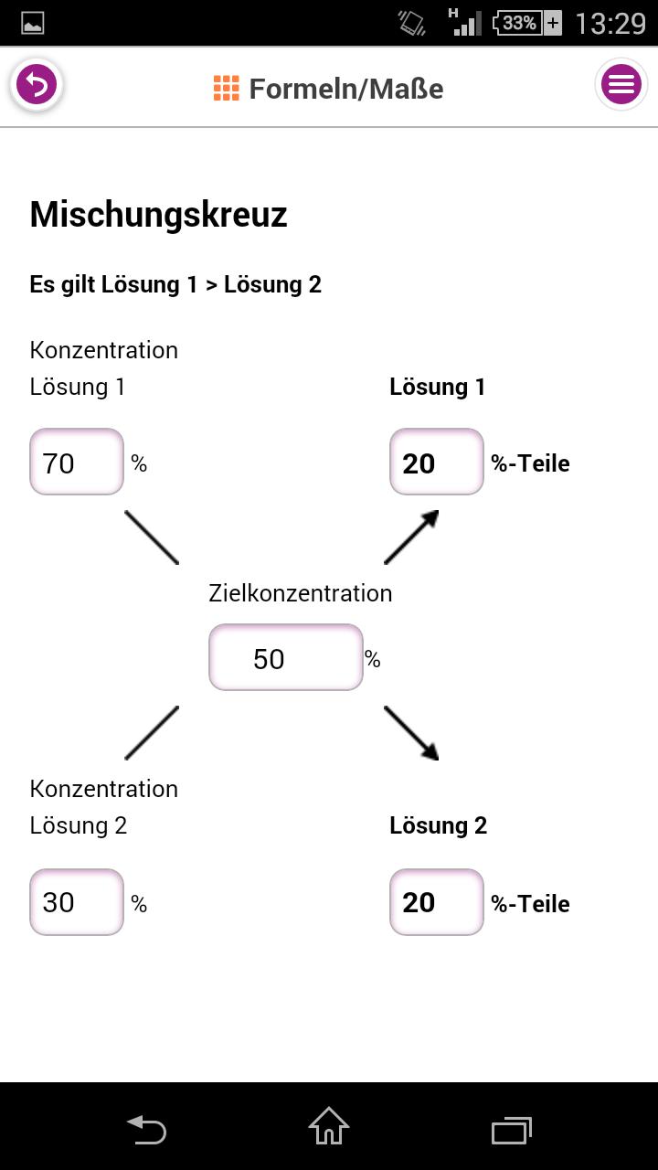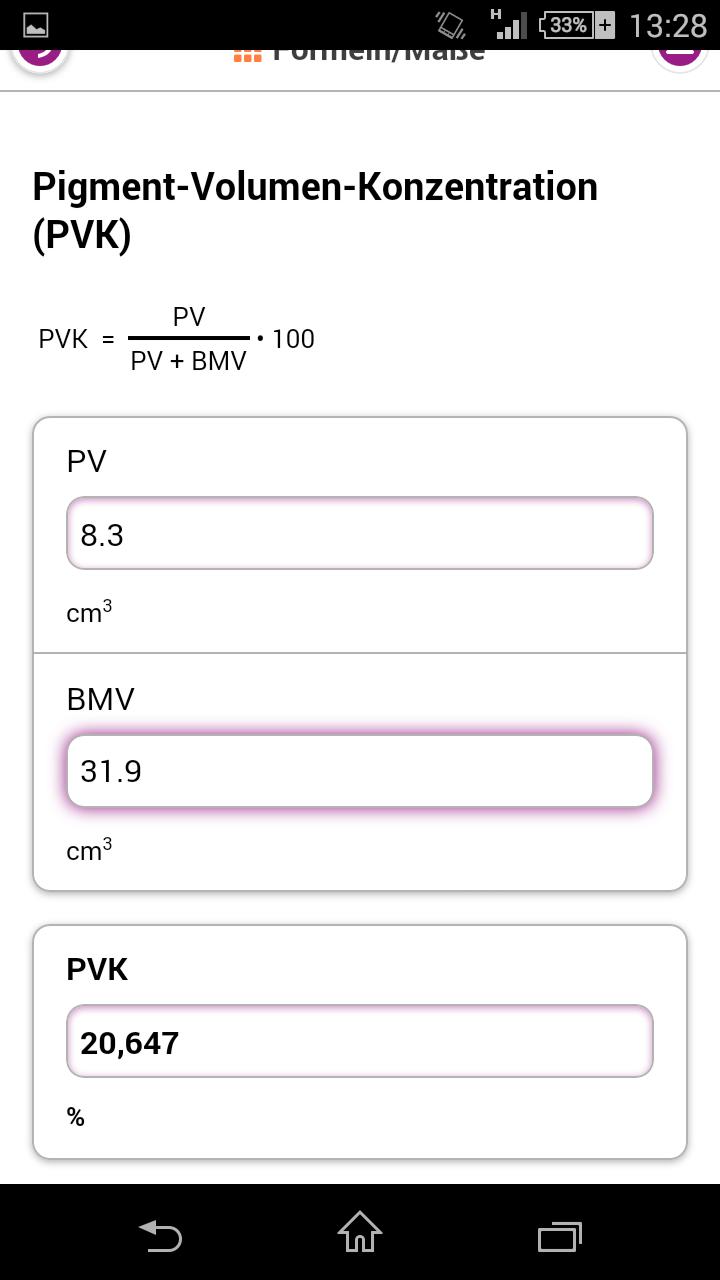 Die integrierte Formelsammlung ermöglicht die sofortige Berechnung wichtiger Parameter und Daten. Ob Pigmentvolumenkonzentration, Mischungskreuz oder Drehzahlumrechnung, durch die Eingabe Ihrer Werte gelangen Sie schnell zum richtigen Ergebnis.
