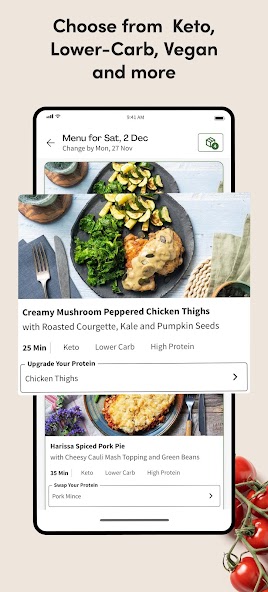 Sie können auch Ihr Mahlzeiten -Kit -Abonnement ändern und zwischen Ihren Vorlieben in nur wenigen Klicks wählen, um Ihre wöchentliche Mahlzeitplanung und -kochen zu belasten. Möchten Sie in einer Woche Keto- und vegane Mahlzeiten probieren? Mit der Green Chef App ist es einfach.