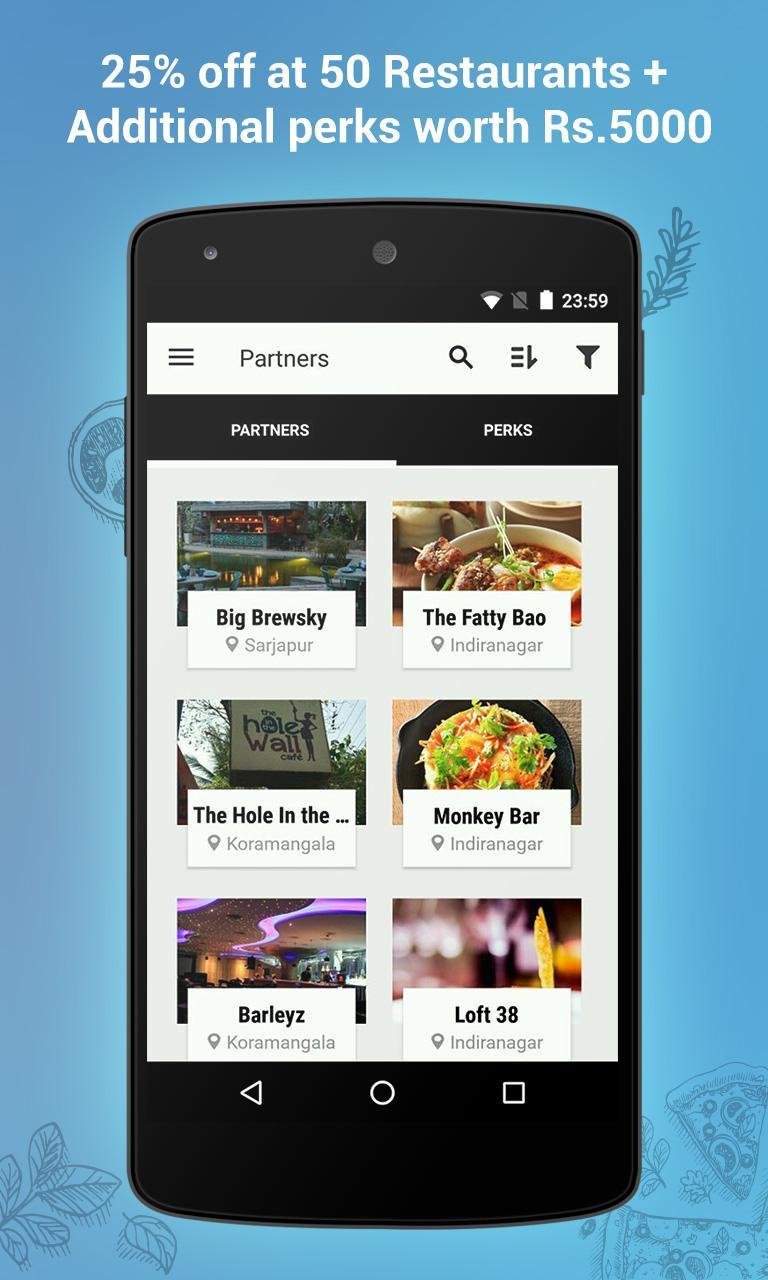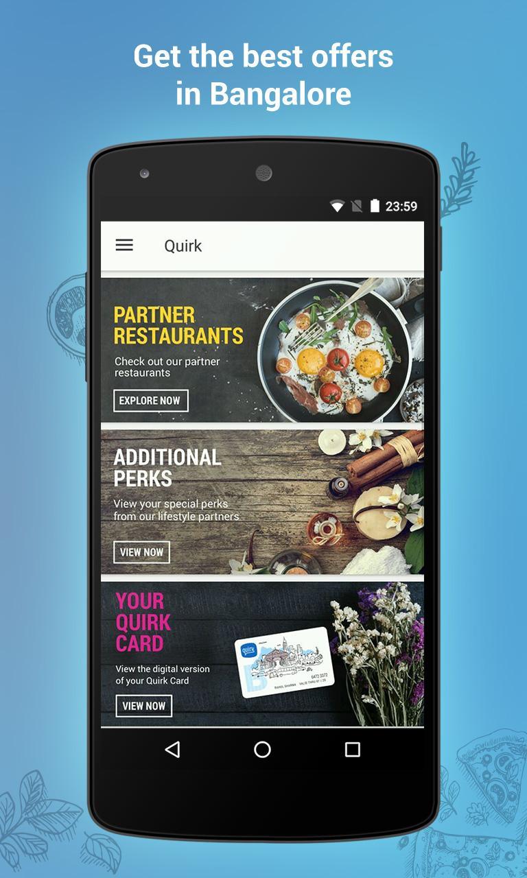 Die Quirk -Karte, Ihr neues städtisches Essential Bangalore, bietet Ihnen einen pauschalen Rabatt von 25% auf Ihre Lebensmittel- und Alkoholrechnung in 50 der besten Restaurants, Pubs, Mikrobrauereien und Lounges in der Stadt! Hier finden Sie eine vollständige Liste unserer Partnerrestaurants!