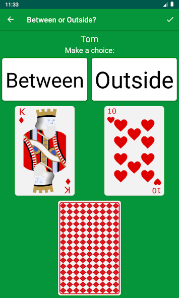 In diesem Spiel müssen alle Spieler erraten, ob die Karte zwischen oder außerhalb der ersten beiden Karten liegt. Wenn beispielsweise die ersten beiden Karten des Spielers sechs und zehn sind, wären acht "zwischen", während fünf "draußen" wären. Wenn der Spieler eine falsche Antwort gibt, muss der Spieler trinken.