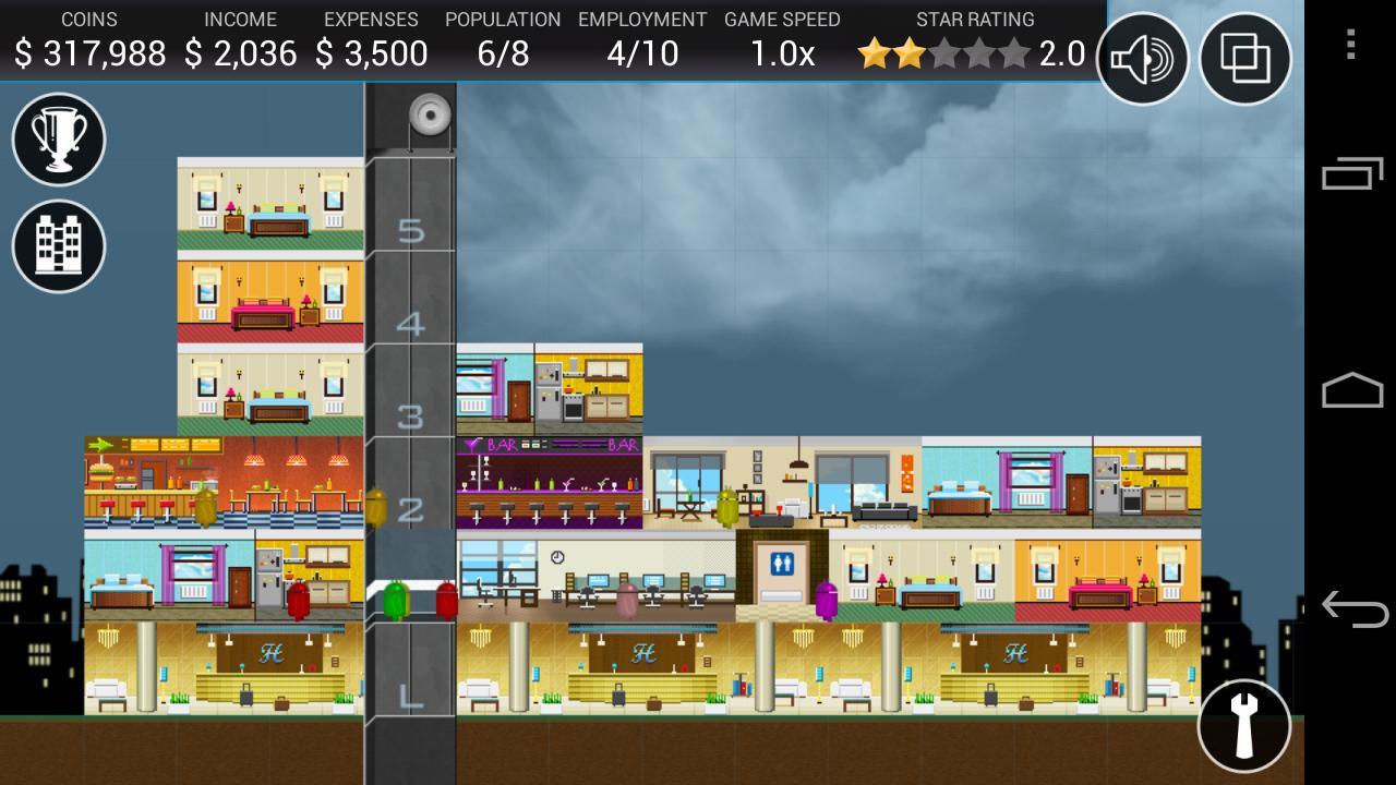 Inspiriert von den Klassikern Yoot Tower und Sim Tower aus den 90er Jahren. Mit keinem anderen Wolkenkratzer, das bei Google Play aufbaut, können Sie wie die Original -Tower -Sims erstellen.