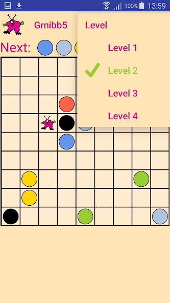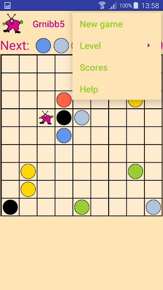 Ein süchtig machendes Spiel, nur zum Spaß. Punkten Sie Punkte, indem Sie fünf oder mehr Kreise auf einer Linie erhalten (horizontal, vertikal oder diagonal). Der Grnibb wird als Joker verwendet und repräsentiert jede Farbe. Das Spiel hat drei verschiedene Schwierigkeitsstufen.