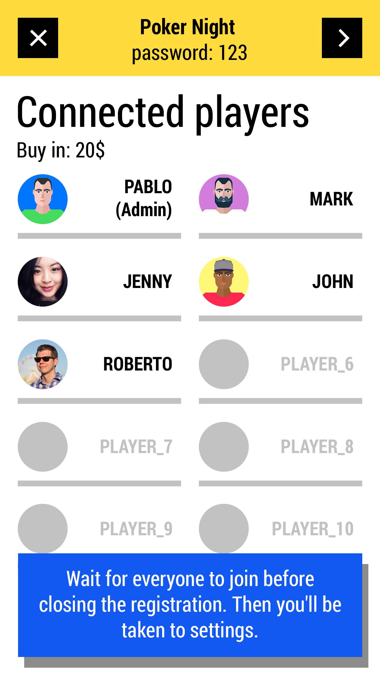 Hat es Ihnen jemals in den Sinn gekommen, dass Sie mit Ihren Freunden ein Live -Poker -Turnier spielen wollten, aber keine Poker -Chips zum Spielen hatten? Jetzt können Sie eine plattformübergreifende mobile App herunterladen und als Ersatz für physische Pokerchips verwenden. Abgesehen davon, dass Sie Poker -Chips zur Verfügung stellen, wird die App auch das Turnier leiten und Sie über die Regeln beraten. Einer von Ihnen erstellt ein privates Turnier und legt die Regeln fest (Startstapel, Levels, Auszahlungen), andere können sich der Gruppe anschließen, indem sie den richtigen Raum auswählen und das Passwort eingeben. Jeder Spieler benötigt ein Smartphone zum Spielen (später ermöglichen wir, dass dasselbe Gerät von mehreren Spielern verwendet wird).