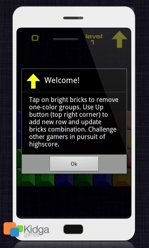 Tippen Sie auf helle Ziegel, um eine Farbgruppe zu entfernen. Verwenden Sie die Schaltfläche "Up" (obere rechte Ecke), um eine neue Zeile hinzuzufügen und die Kombination aus Ziegeln zu aktualisieren. Fordern Sie andere Spieler heraus, um HighScore zu verfolgen.